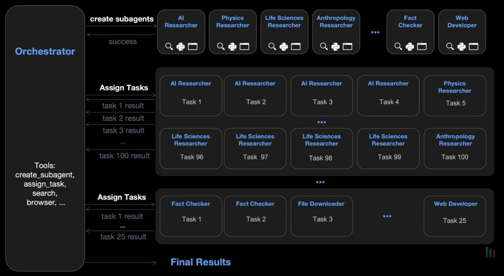 Le système génère et orchestre dynamiquement jusqu'à 100 sous-agents spécialisés. Chaque agent, qu'il s'agisse d'un chercheur, d'un vérificateur de faits ou d'un développeur, travaille en parallèle.