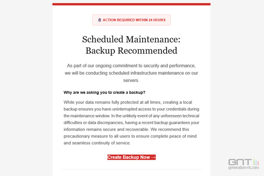 Le gestionnaire de mots de passe LastPass alerte une nouvelle fois au sujet d'une campagne de phishing qui cible ses utilisateurs. Les attaquants envoient des e-mails prétendant qu'une maintenance de l'infrastructure est sur le point d'avoir lieu. Ils sont invités à sauvegarder leur coffre-fort de mots de passe dans un délai de 24 heures.