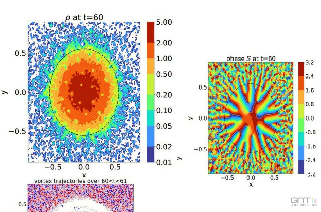 Un superfluide étant "irrotationnel", il ne peut accommoder une rotation globale qu'en créant des singularités : de minuscules tourbillons, ou vortex. Les simulations montrent que ces vortex s'organisent en un réseau de vortex stable, s'alignant sur l'axe de rotation du halo.