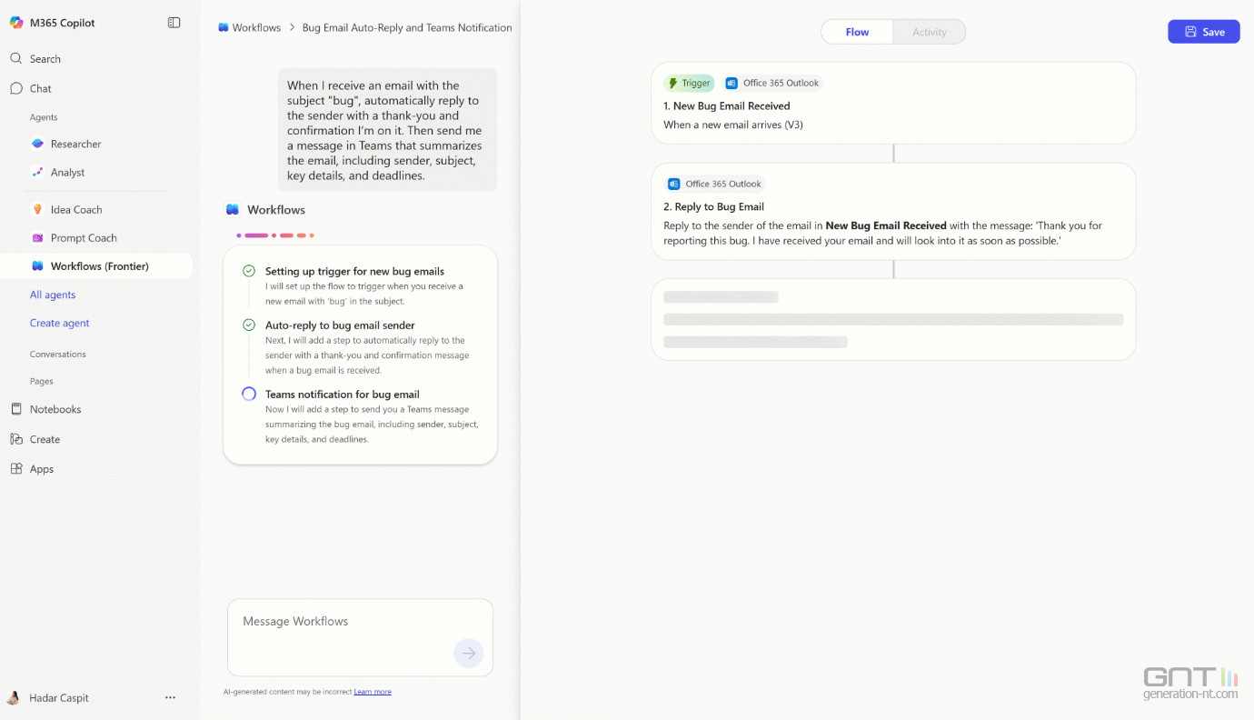 L'agent Workflows s'attaque à l'automatisation des tâches répétitives. Il suffit de décrire un processus, et Copilot le convertit en flux automatisés à travers des services comme Outlook, Teams, SharePoint ou Planner.