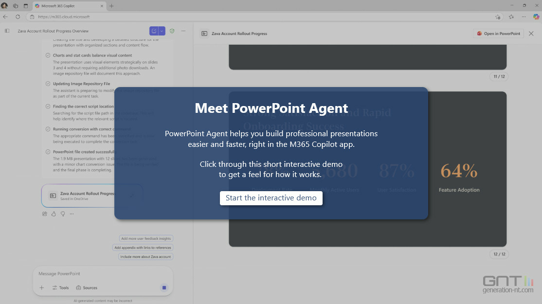 Déjà lancé pour Excel et Word, il permet aux utilisateurs de collaborer avec l'assistant IA de Microsoft pour générer des documents et des tableurs complexes. La nouveauté est son extension à PowerPoint, où il pourra mettre à jour des modèles de marque, créer de nouvelles diapositives, formater le contenu et extraire le contexte des données de travail et des sources web.