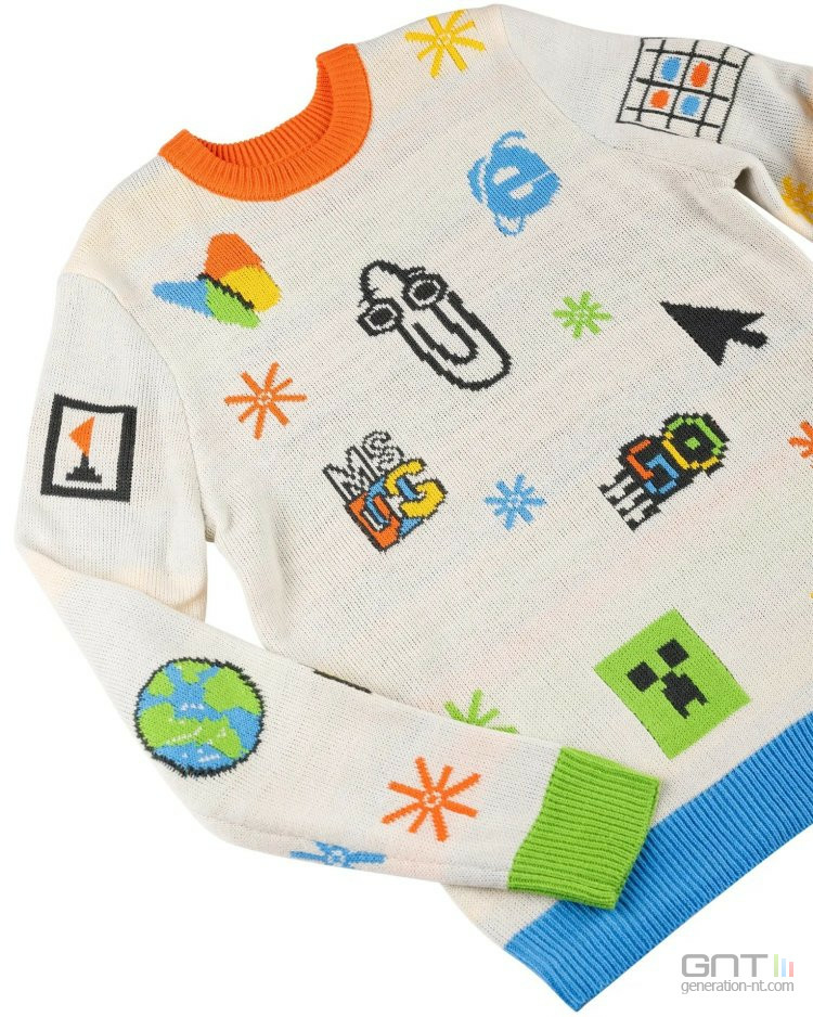 On y retrouve des figures emblématiques comme Clippy, l'inoubliable assistant trombone, mais aussi les logos de MSN, Internet Explorer, Démineur ou encore MS-DOS. Pour marquer le 50e anniversaire de la société, le chiffre "50" y est aussi inscrit, aux côtés d'un clin d'œil plus moderne et surprenant : le logo de l'IA Copilot, discrètement placé sur la manche droite.