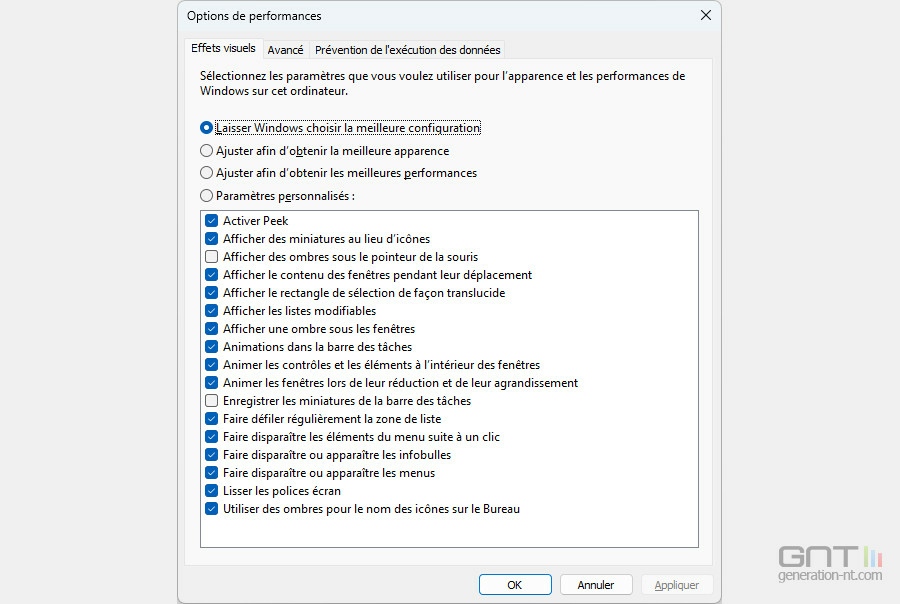 Le cas échéant, un petit tour du côté du réglage de l'apparence et des performances de Windows est préconisé, par exemple en saisissant " performances " dans la zone de recherche de la barre des tâches.