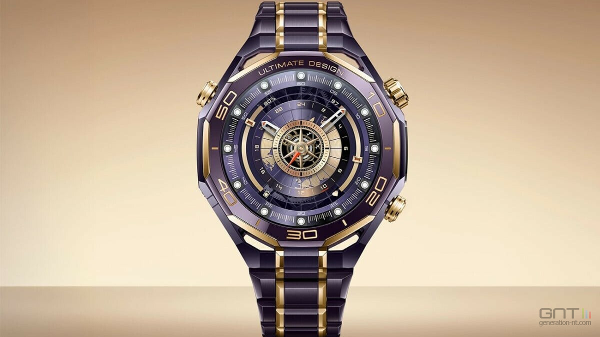Loin d'être un simple gadget, cette nouvelle création de Huawei est un véritable objet d'artisanat. Son design impressionnant repose sur une lunette en céramique violette incrustée d'or 18 carats, un boîtier forgé dans un métal liquide zirconium et un bracelet en alliage de titane. Le format est imposant, avec un boîtier de 48,3 mm et un poids de 80,9 g sans le bracelet, affirmant son caractère haut de gamme.