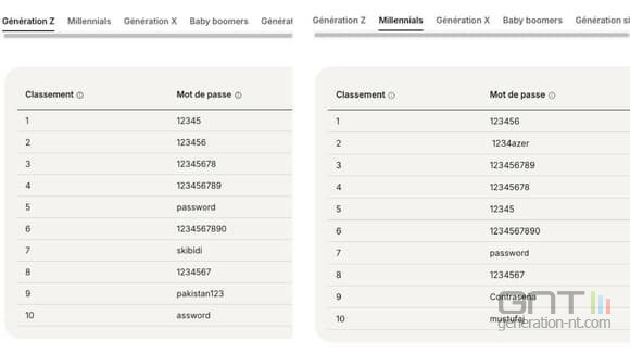 Que l'on soit Gen Z, Millennial, ou Baby-boomer, le recours à des séquences numériques courtes ou à des mots de passe liés à la vie privée est la norme. Si les plus jeunes ont tendance à privilégier les codes plus rapides à taper sur un téléphone, ou utilisent des références culturelles d'internet (comme "skibidi"), ils commettent les mêmes erreurs fondamentales que leurs aînés, qui eux optent plus souvent pour des prénoms ou des années de naissance.