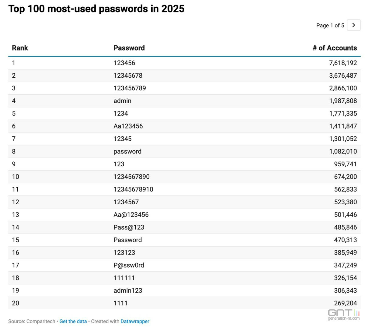 La paresse ne s'arrête pas là. Le reste du top 10 est sans surprise. On y trouve les classiques "admin" (4e) et "password" (8e).