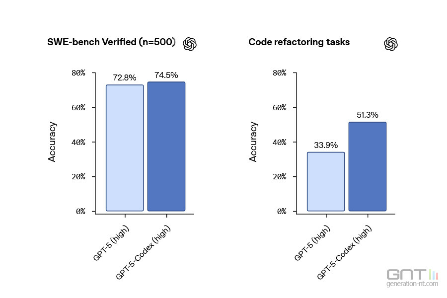 Sur le benchmark SWE-bench Verified, qui mesure les capacités de codage d'une IA, GPT-5-Codex atteint un taux de réussite de 74,5 %. Il surpasse également largement GPT-5 sur les tâches de refactorisation de code, passant de 33,9 % à 51,3 % de succès.