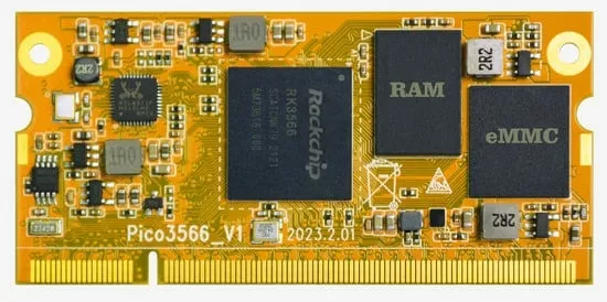 Le PICO3566 offre également une compatibilité avec le PCIe Gen 2 (1 x 1 voie) et est équipé d'un connecteur SODIMM à 200 broches, similaire au CM3+, ainsi qu'un en-tête GPIO à 66 broches, parmi d'autres interfaces E/S.