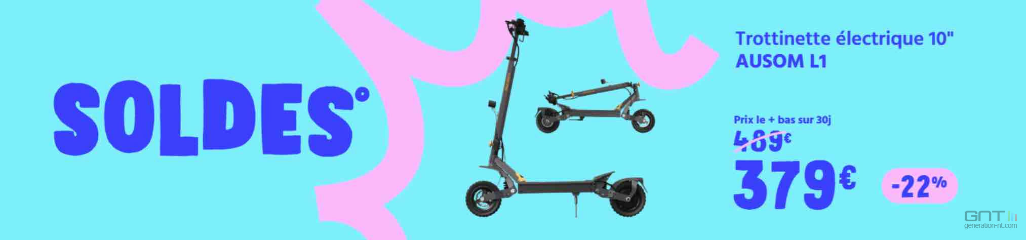 - Trottinette électrique Ausom L1 à 379 € soit -22% + 20% à cagnotter pour les membres (800W-1100W, pneus 10", suspension à bras oscillant, autonomie 70 km, vitesse max 45 km/h)
