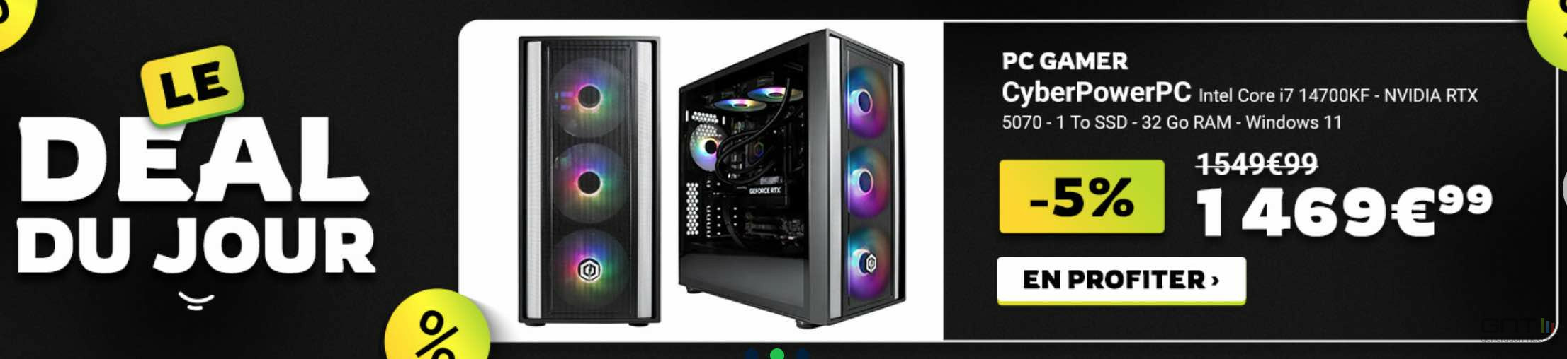 - PC gamer CyberPowerPC à 1 469,99 € soit -5% (Core i7 14700KF 20 cœurs, RTX 5070 12 Go, RAM 32 Go DDR5, SSD 1 To, Windows 11)