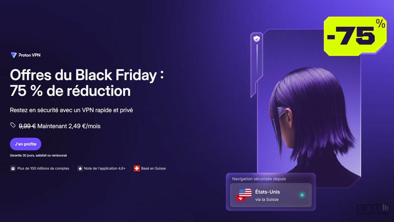 À l'occasion du Black Friday, Proton propose 75 % de réduction sur l'abonnement deux ans à Proton VPN Plus. Il passe ainsi de 9,99 € par mois à 2,49 € par mois les 24 premiers mois (pour un total de 59,76 € sur la période promotionnelle).