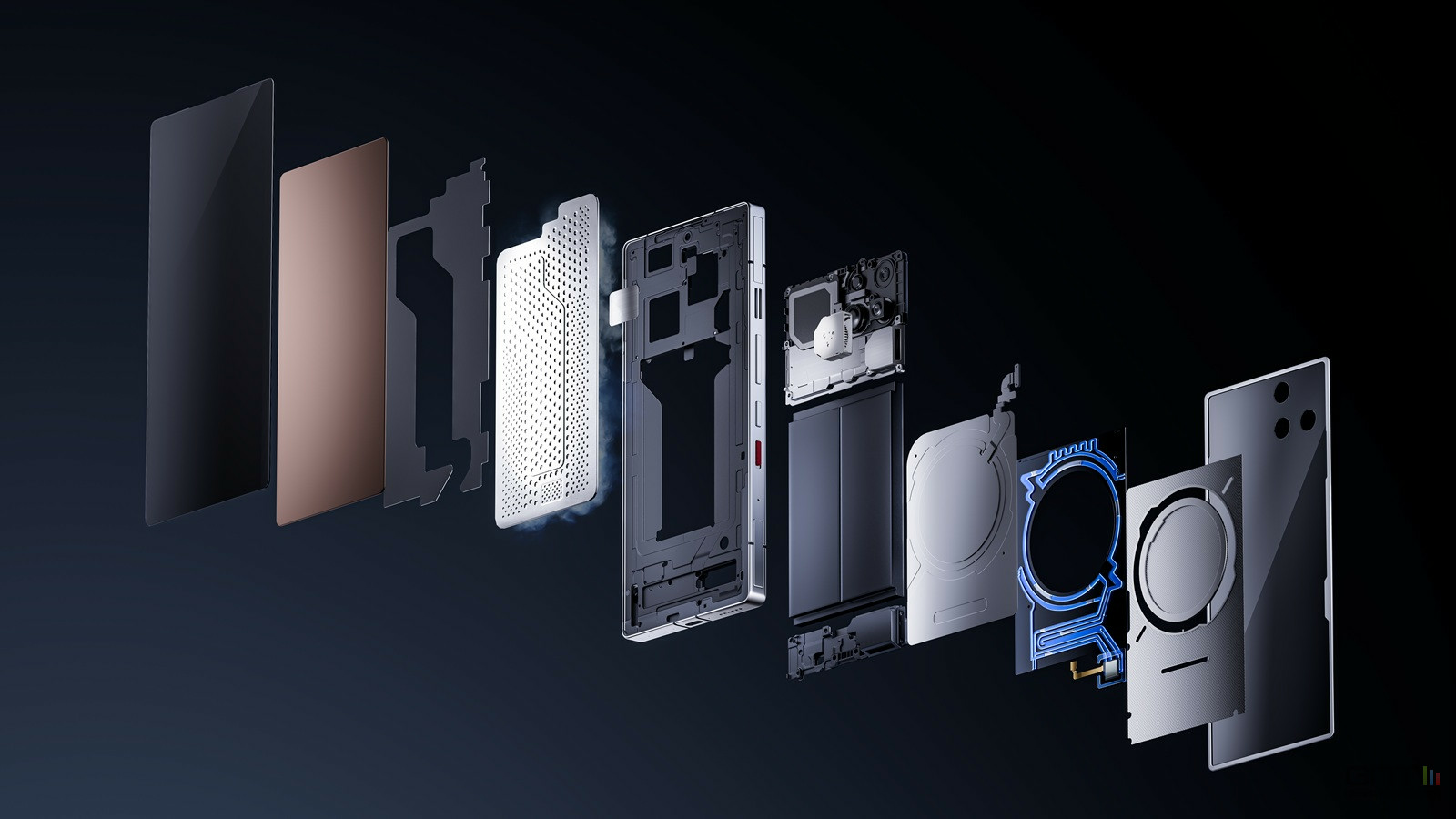 Ce système est couplé à un ventilateur Turbo Fan 4.0 amélioré, capable d'atteindre 24 000 tours par minute, et une chambre à vapeur 4D Cooler VC. Selon RedMagic, cette architecture à quatre couches augmente l'efficacité du refroidissement de 50 %. Le tout est mis en scène par un design audacieux, avec un anneau translucide révélant le liquide en mouvement.