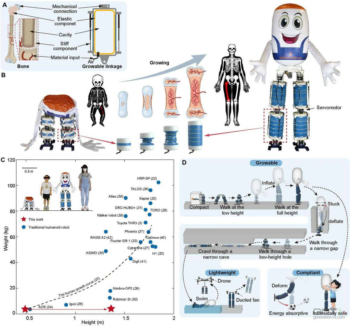 GrowHR est un robot humanoïde expérimental léger (4,5 kg) et flexible, développé en Chine. Sa particularité est son squelette extensible, inspiré des os humains, qui lui permet de modifier radicalement sa taille et sa forme pour s'adapter à son environnement.
