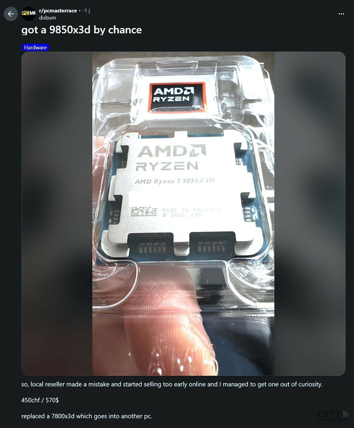 La première surprise vient de Suisse. Un revendeur local a visiblement manqué le mémo concernant la date de lancement et a mis en vente le processeur plusieurs jours avant l'heure. Un utilisateur de Reddit a ainsi pu se procurer la précieuse puce, preuve à l'appui, pour la coquette somme de 450 francs suisses, soit environ 570 dollars. Un tarif bien supérieur aux 499 dollars annoncés officiellement par AMD.