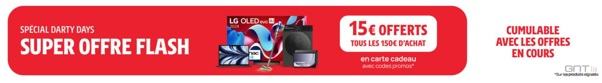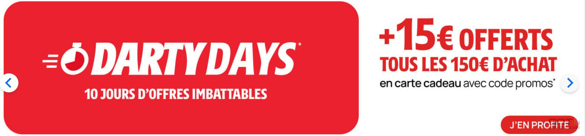 - 15 € offerts en carte cadeau dès 150 € d'achat sur les univers Petit électroménager, Son, Objets connectés, Mobilité Urbaine, Imprimantes et Tablettes Android avec le code DARTY150,