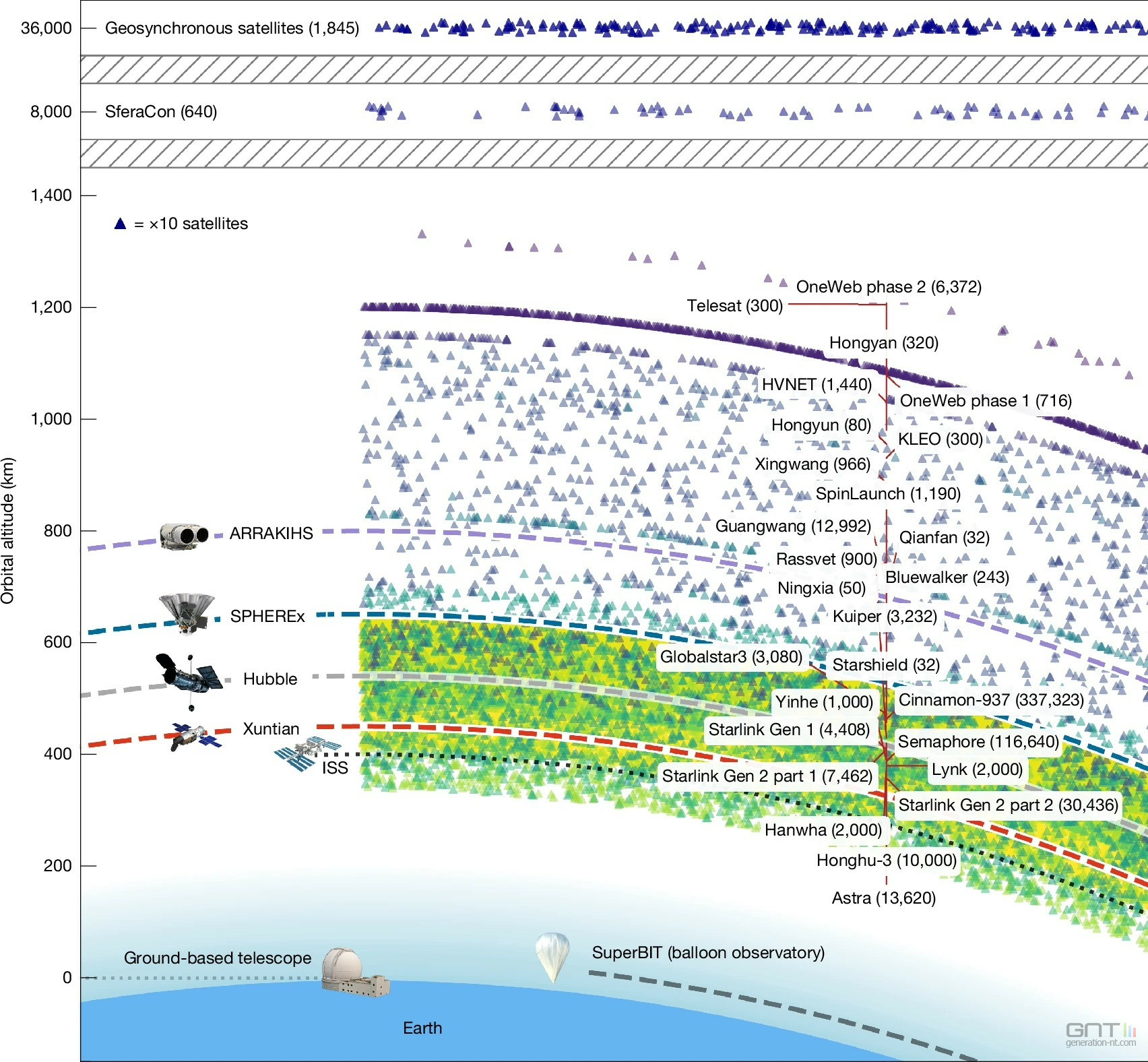 Nous sommes passés de 5 000 en 2019 à plus de 15 000 aujourd'hui, et les projections évoquent un chiffre vertigineux de 560 000 engins d'ici dix ans. Ces immenses constellations de satellites, bien que connectant le monde, dressent un voile de plus en plus opaque entre nous et l'univers.
