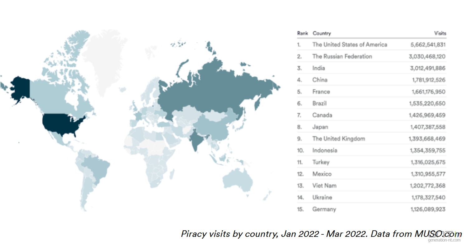Selon la société britannique MUSO, la consultation mondiale pour les sites de piratage a atteint 52,5 milliards de visites au premier trimestre 2022. Une augmentation de 29,3 % par rapport au premier trimestre 2021.