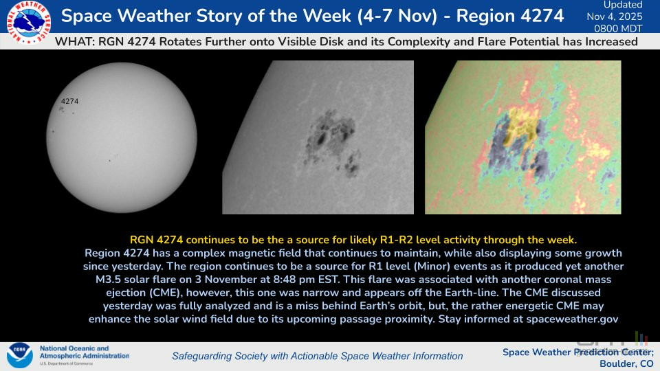 L'origine de toute cette agitation est une région active particulièrement instable, baptisée AR4274. Ce groupe de taches solaires, décrit par les experts comme étant magnétiquement très complexe, ne s'est pas arrêté là et a également produit une éruption significative de classe M7.4 le 5 novembre.