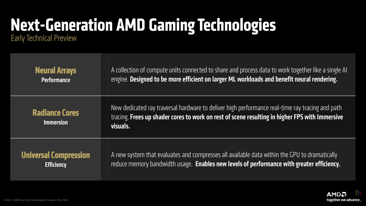 AMD a ainsi présenté les Radiance Cores, de nouvelles unités dédiées au ray tracing et au path tracing en temps réel. A priori, il s'agit d'un équivalent des RT Cores de Nvidia. Leur fonction est de déchager les shader cores, leur permettant ainsi de se concentrer sur le reste de la scène graphique.