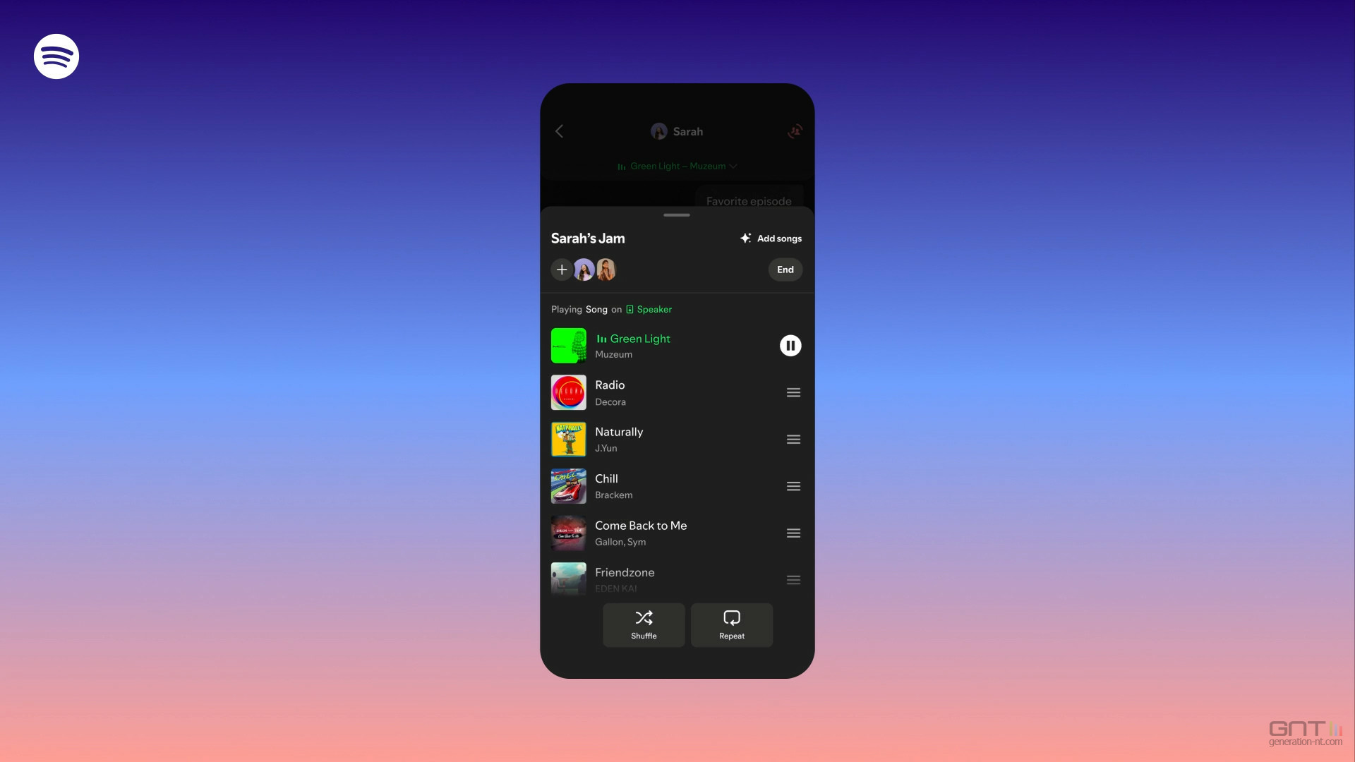 Si celui-ci accepte, il devient l'hôte de la session et les deux participants peuvent alors ajouter des morceaux à une file d'attente partagée et écouter la même musique de manière synchronisée. Spotify suggère en outre des titres basés sur les goûts combinés des participants.