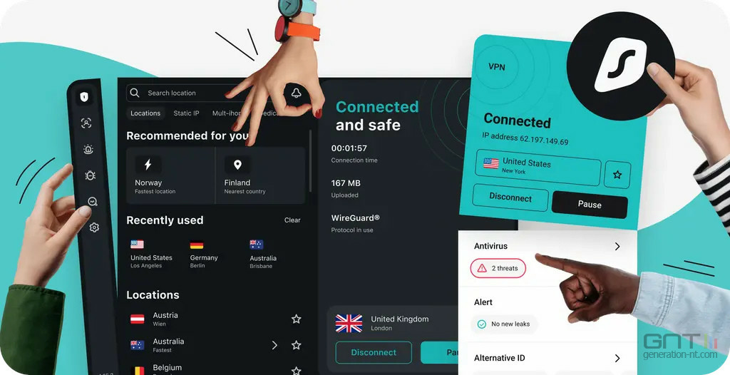 Pour un nombre illimité d'appareils protégés simultanément et une centaine d'emplacements avec plus de 4 500 serveurs, le forfait Starter de Surfshark comprend les fonctionnalités VPN, la génération d'adresses e-mail masquées et d'informations personnelles sécurisées.