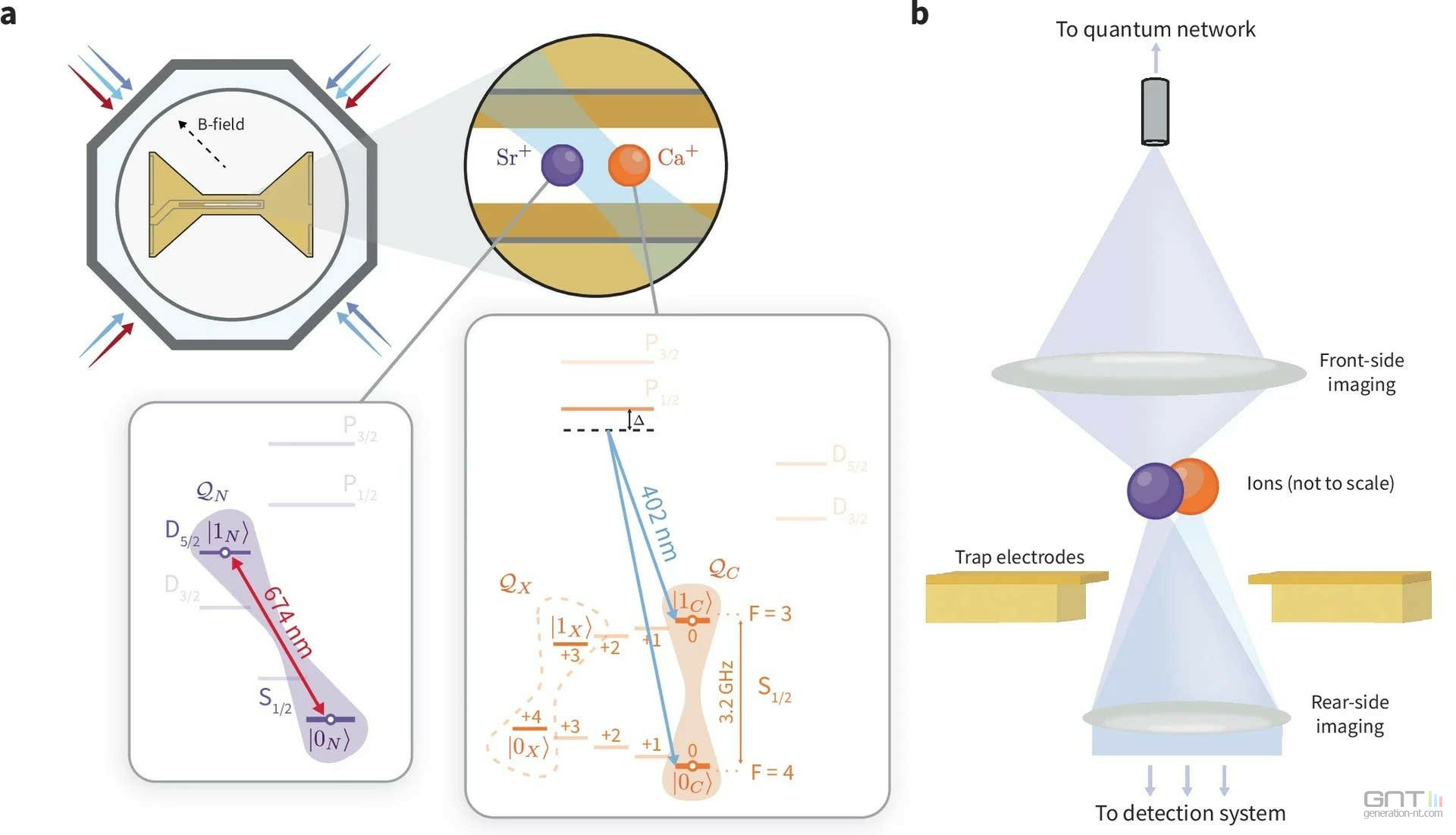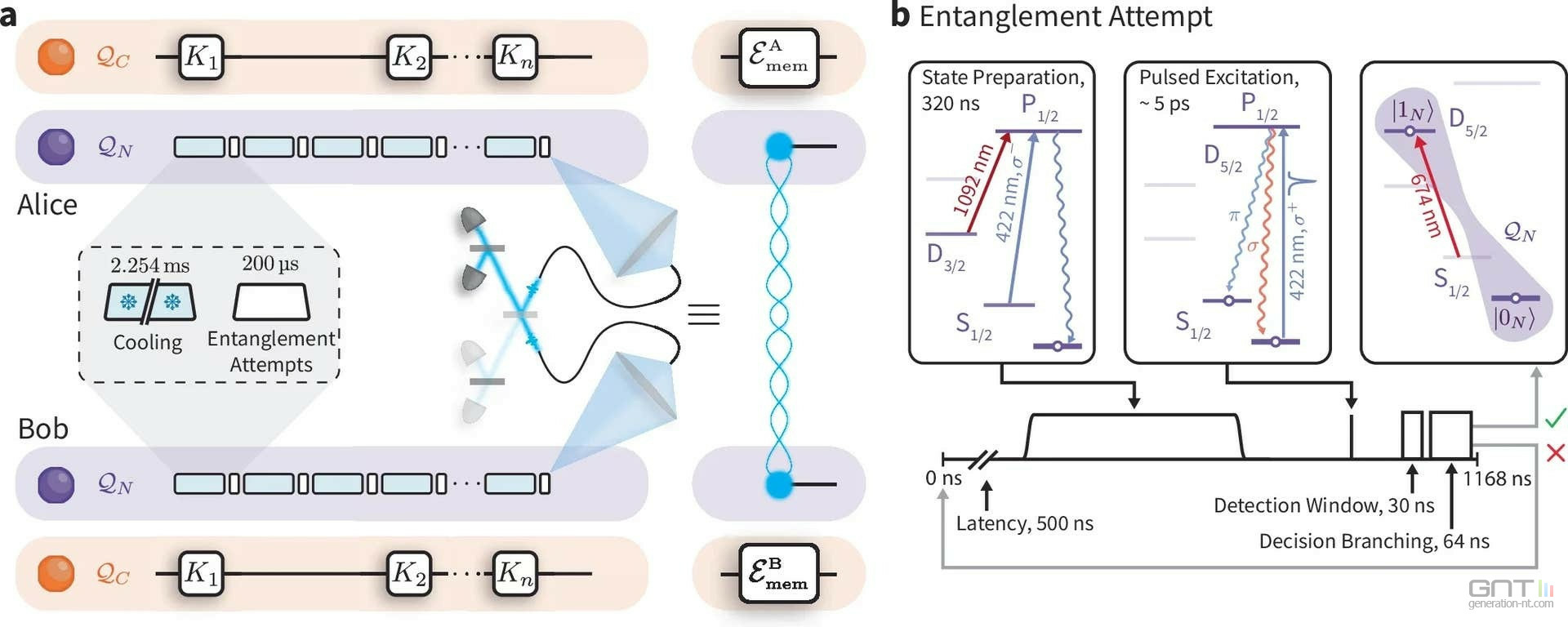 Les chercheurs ont utilisé deux petits ordinateurs quantiques modulaires, surnommés « Alice » et « Bob ». Chacun contient des ions piégés qui servent de qubits (les bits quantiques). Pour les connecter, ils ont eu une idée : chaque module émet un photon. Ces deux photons sont dirigés vers un analyseur central qui les rend intriqués, établissant ainsi un « pont quantique » entre les deux appareils.