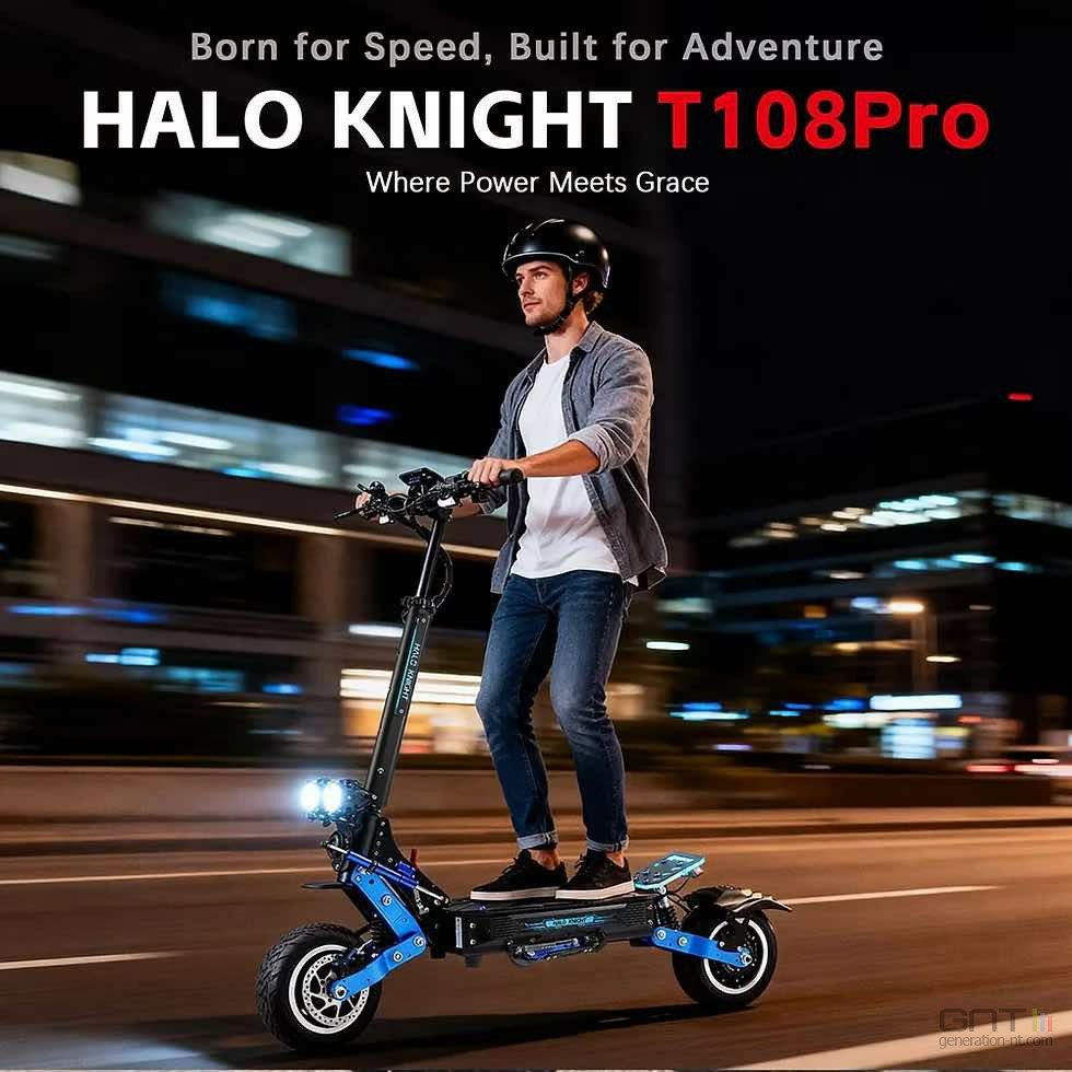 • Halo Knight T108 Pro (version 2025) à 1 469 € avec le code NNNFRT108V (prix officiel 1 499 €) (double moteur 3000W x2, batterie 60V 38,4Ah, pneus 11", vitesse max 95 km/h, autonomie max 80 km, double frein hydraulique, suspension à ressorts avant et arrière)