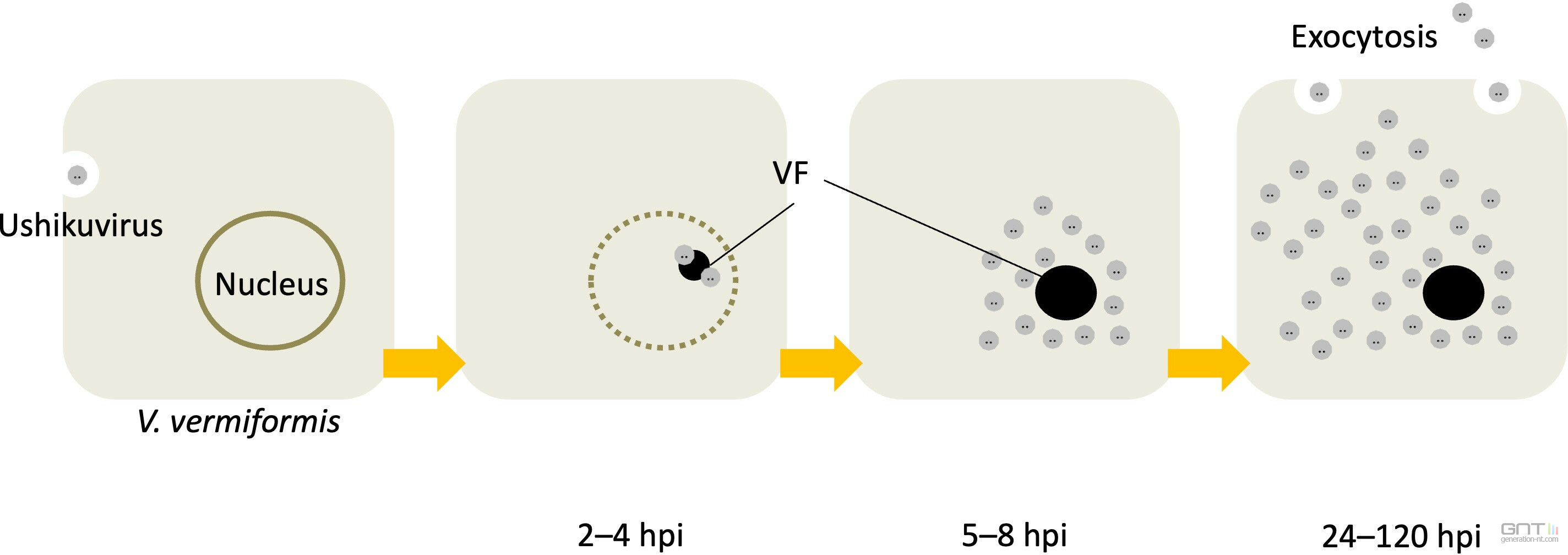 Isolé dans les eaux du lac Ushiku au Japon par l'équipe du professeur Masaharu Takemura, l'ushikuvirus cible une amibe unicellulaire nommée Vermamoeba. Une fois à l'intérieur, son comportement le distingue de ses plus proches parents.