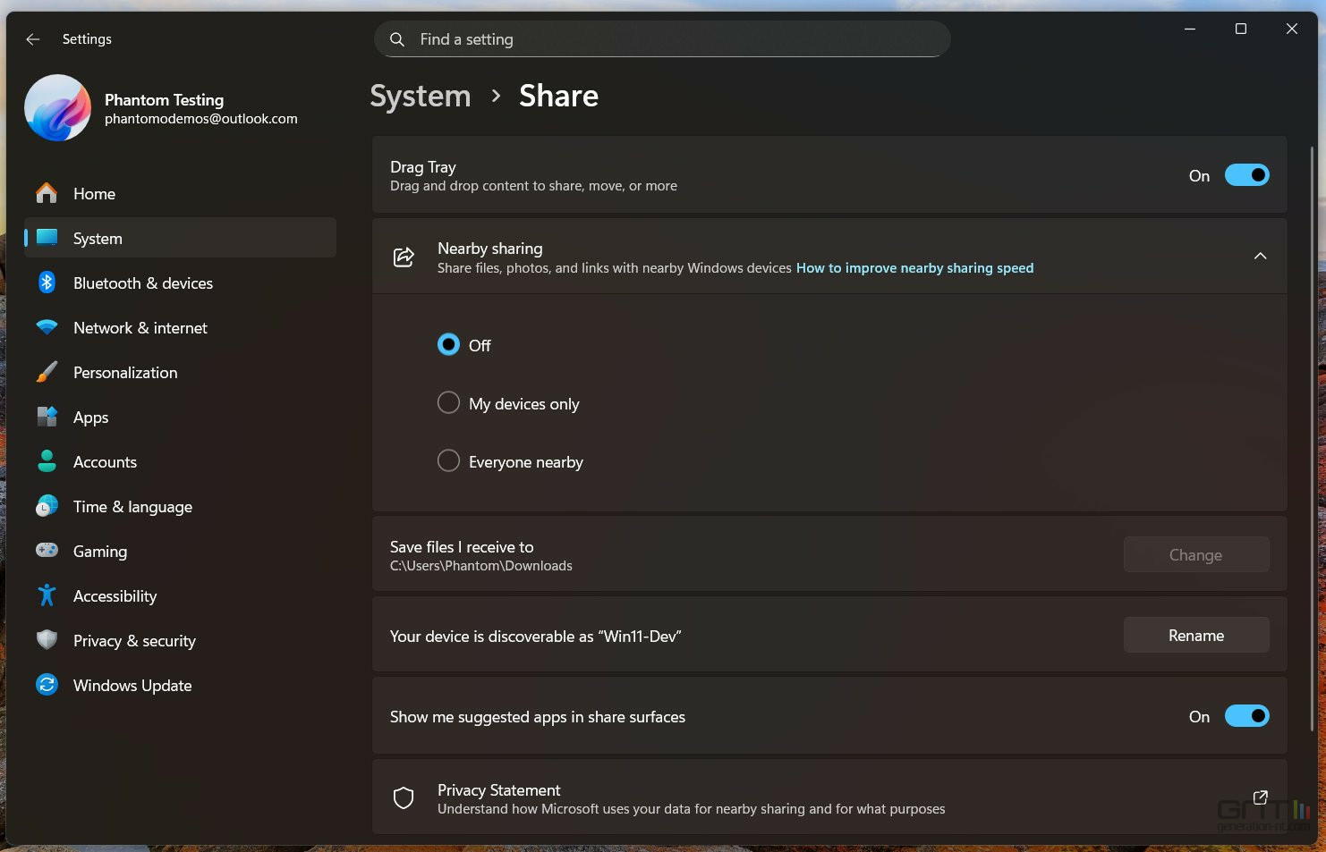 Dans une build de la préversion de Windows 11, le leaker Phantomofearth a découvert une modification de la page des paramètres. " Partage de poximité " se mue en simplement " Partage " et accueille un nouvel interrupteur.