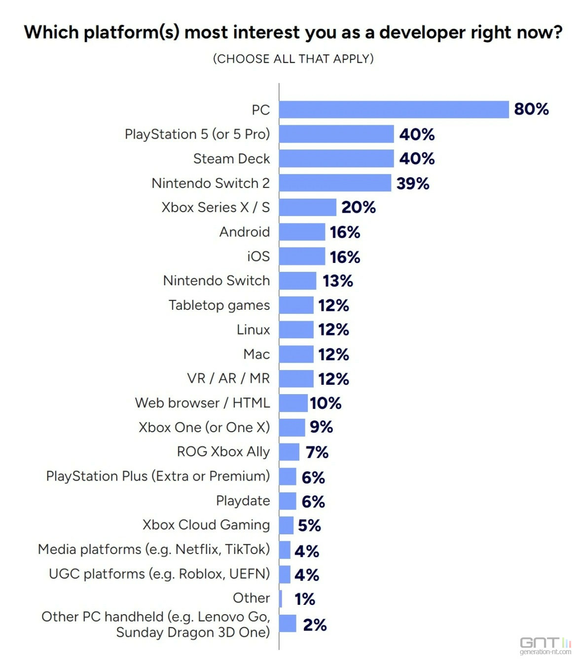On note que les intententions de développement ne grimpent qu'à 40% sur PS5 et Switch 2, contre 80% sur PC, signe que, peut-être, la fin de la guerre entre consoles et PC est en passe de se terminer, et que les consoles de jeu ne représentent plus vraiment l'avenir du jeu vidéo...