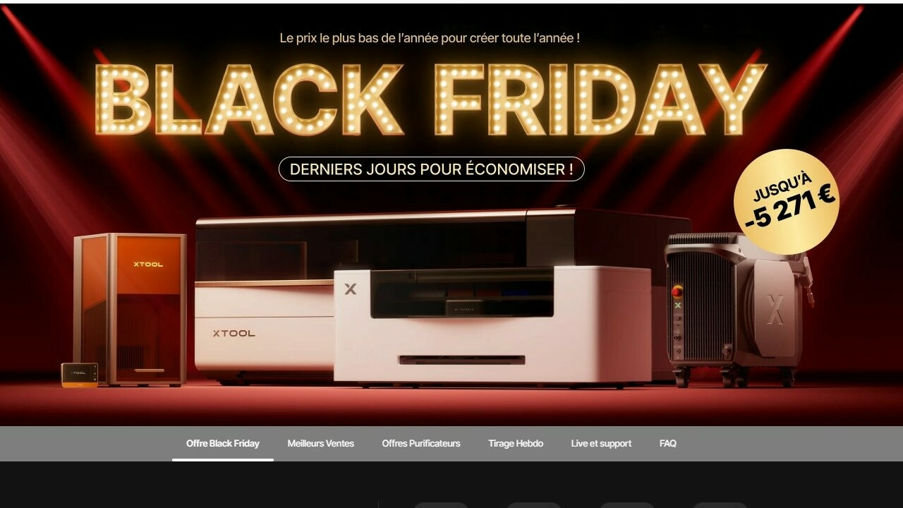 Pendant toute la période Black Friday & Cyber Monday, la gamme xTool bénéficie de remises exceptionnelles, de cadeaux offerts et de facilités de paiement. Voici un aperçu des meilleures opportunités, avec un zoom sur deux machines phares particulièrement adaptées au marché français.