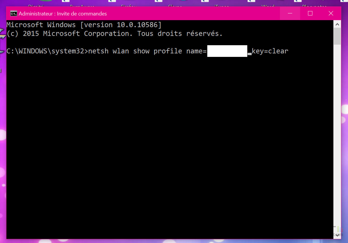 De là, saisir la requête "netsh wlan show profile name=XXX key=clear", en remplaçant "XXX" par le nom de votre réseau sans-fil, avant de valider avec la touche Entrée.