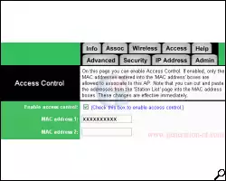 Retournez sur la configuration du P.A.Allez dans l'onglet "Access", ici cochez la case "enable access control" et rentrez l'adresse MAC (adresse physique) que vous venez de noter, puis confirmerz en cliquant sur "reboot" en bas de la page ( vous avez la possibilité de restreindre l'accès au P.A. à 11 autres cartes Wifi).
