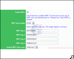 Allez dans l'onglet "Security", cochez la case "Enable WEP" et choisissez la taille de cryptage de la clé (64 ou 128 bits). Je vous conseille de choisir un cryptage 128 bits si votre carte PCMCIA est capable de décrypter/encrypter une clé en 128 bits.