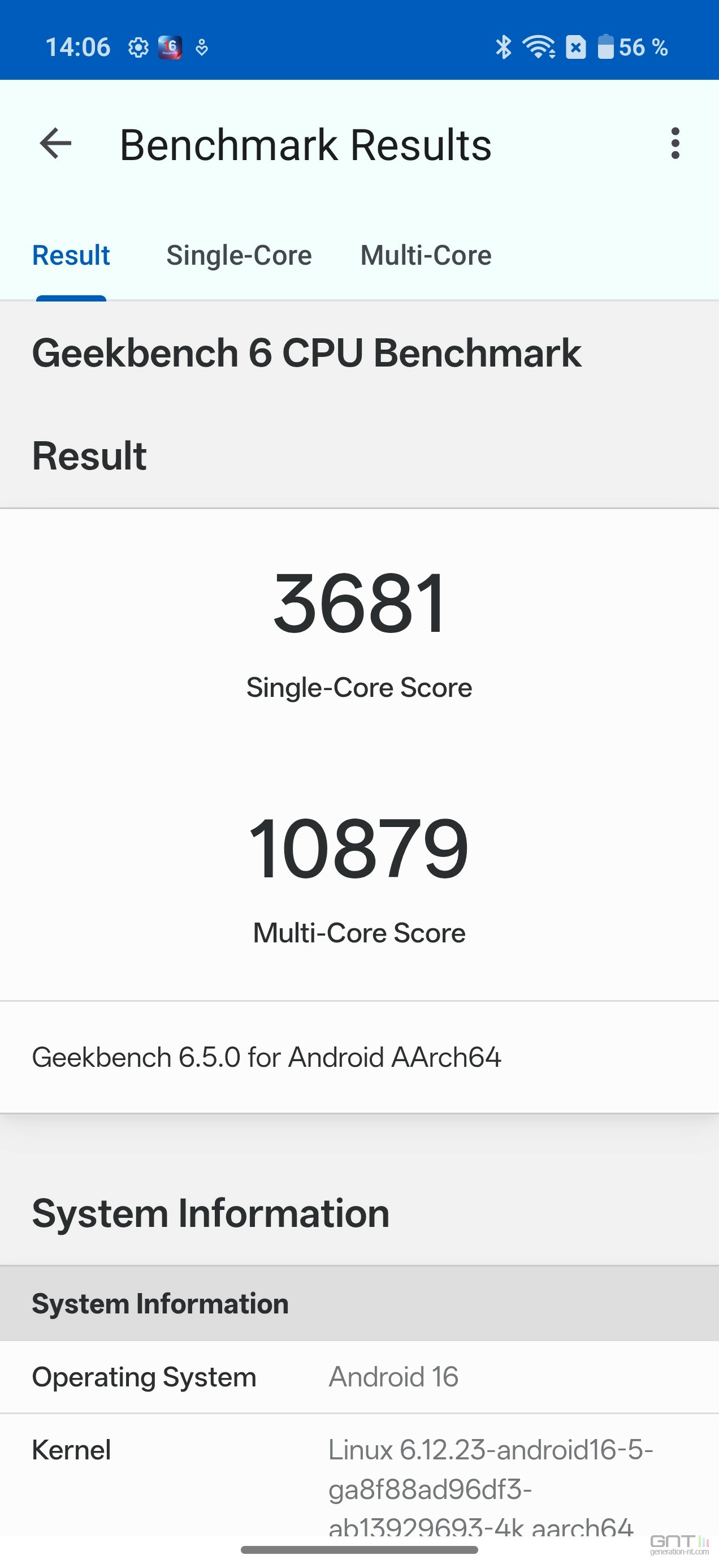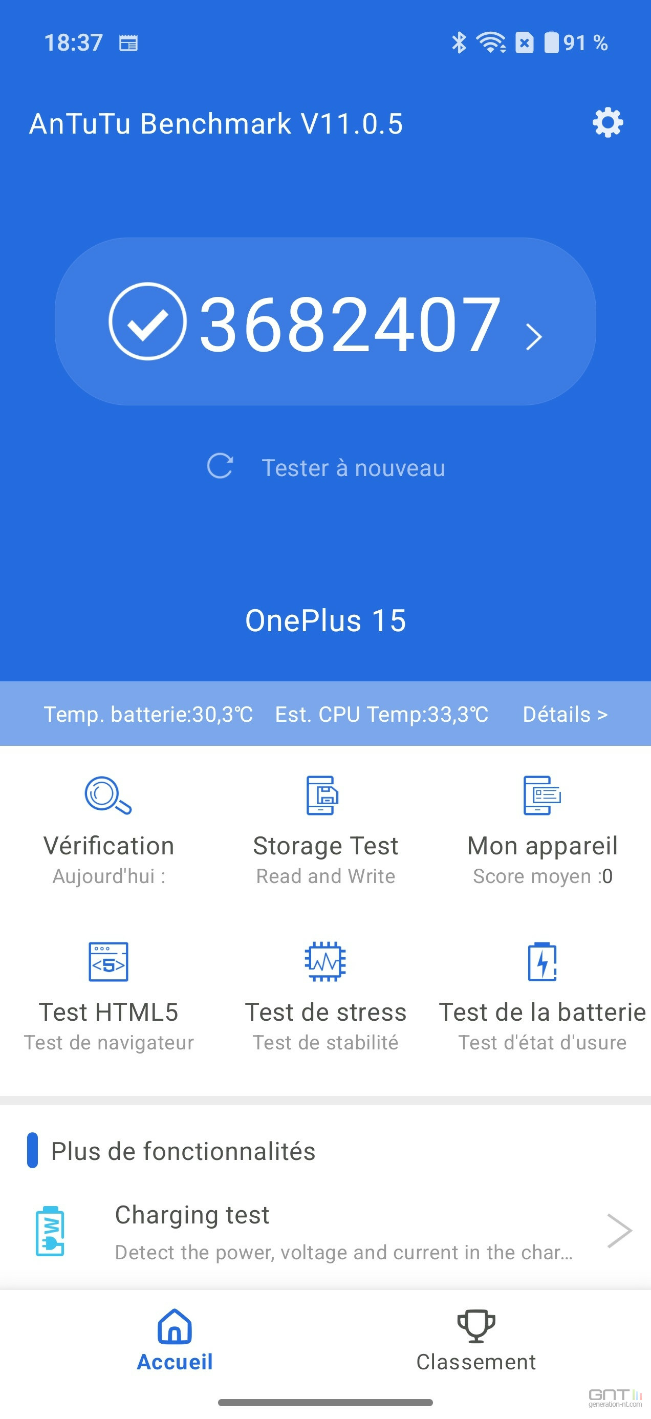 Les résultats en benchmark sont donc ceux d'un appareil mobile haut de gamme. Le benchmark AnTuTu fournit un résultat de 3,7 millions de points tandis que Geekbench 6 crédite le OnePlus 15 d'un score de 3680 points en test single core et 10870 points en test multicore.