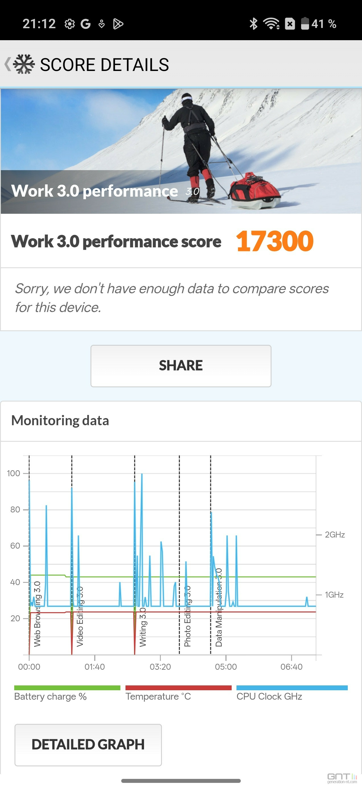 Du côté du test synthétique de réactivité de l'interface de PCMark, le smartphone atteint 17300 points. Le GPU n'est pas en reste puisque sur 3DMark, les différents benchmarks fournissent les résultats suivants :