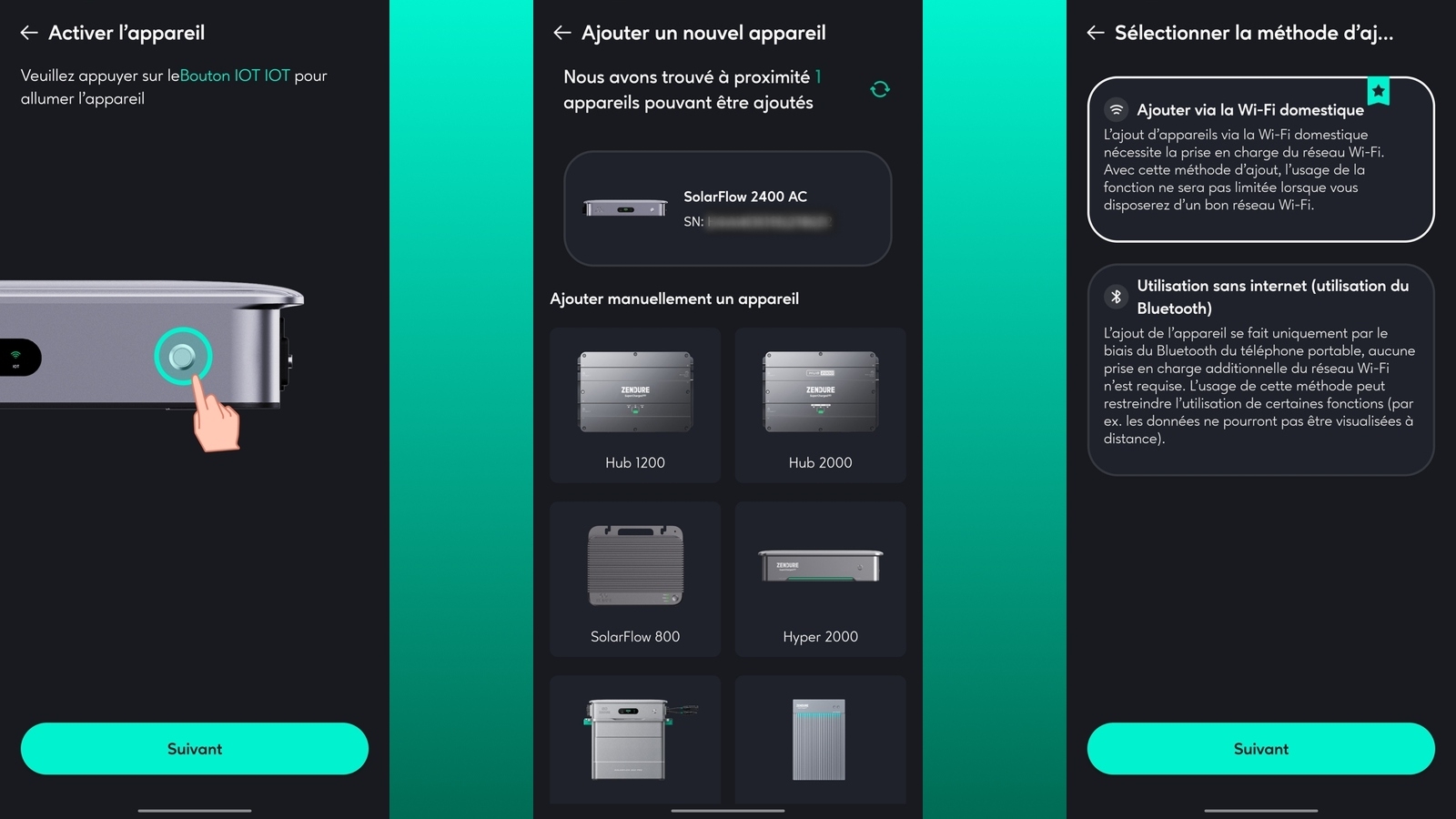 Dès l'installation de l'application, vous serez invité à ajouter votre appareil. Il suffit alors de suivre les instructions à l'écran, voici un aperçu du processus.