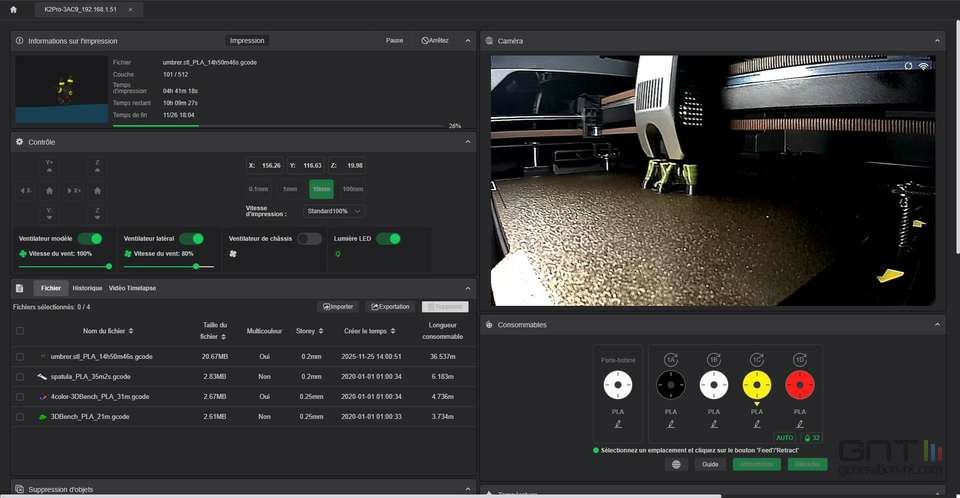 On l'a dit juste avant, la K2 Pro embarque donc deux caméras, dont une seule est réellement accessible directement à l'utilisateur pour surveiller la progression des impressions. Elle est associée à un module d'intelligence artificielle pour repérer les obstacles (pièce qu'on aurait oubliée avant de lancer la prochaine impression), les erreurs (mode spaghetti) ou même des pièces qui se décrocheraient ou s'écrouleraient... L'utilisateur reçoit alors une notification et peut visualiser le problème (y compris depuis son smartphone) pour choisir de reprendre le travail ou de stopper complètement.