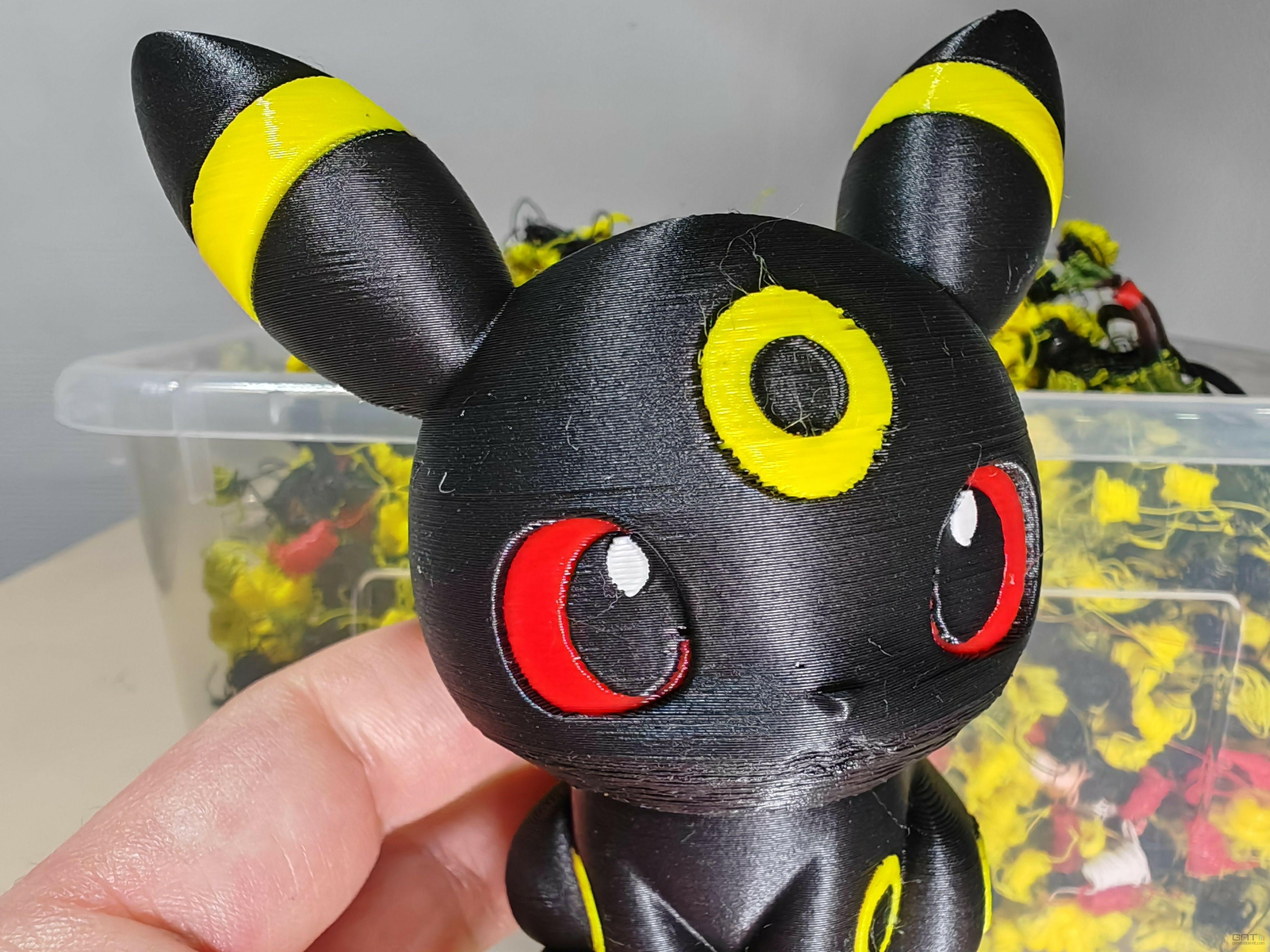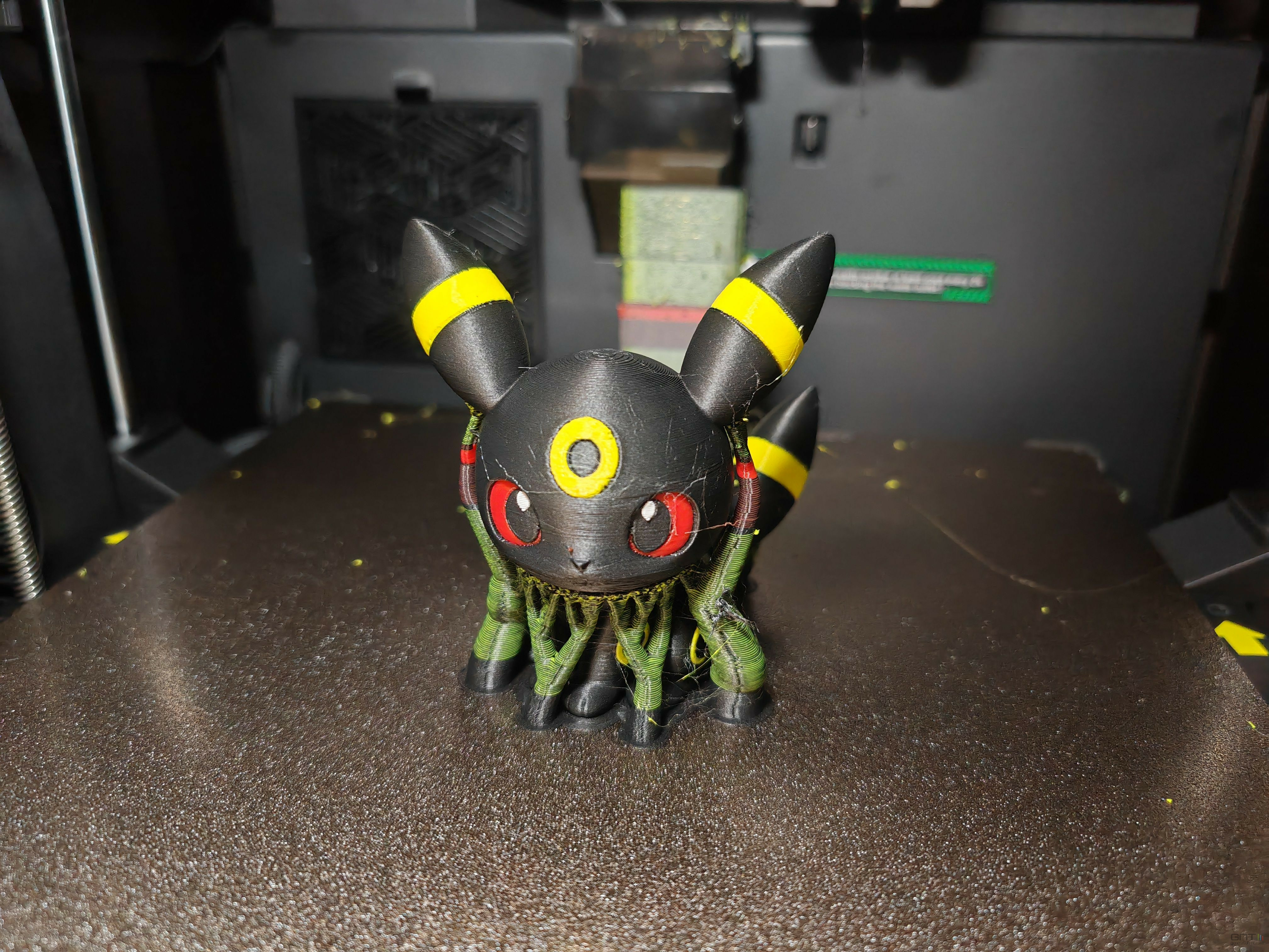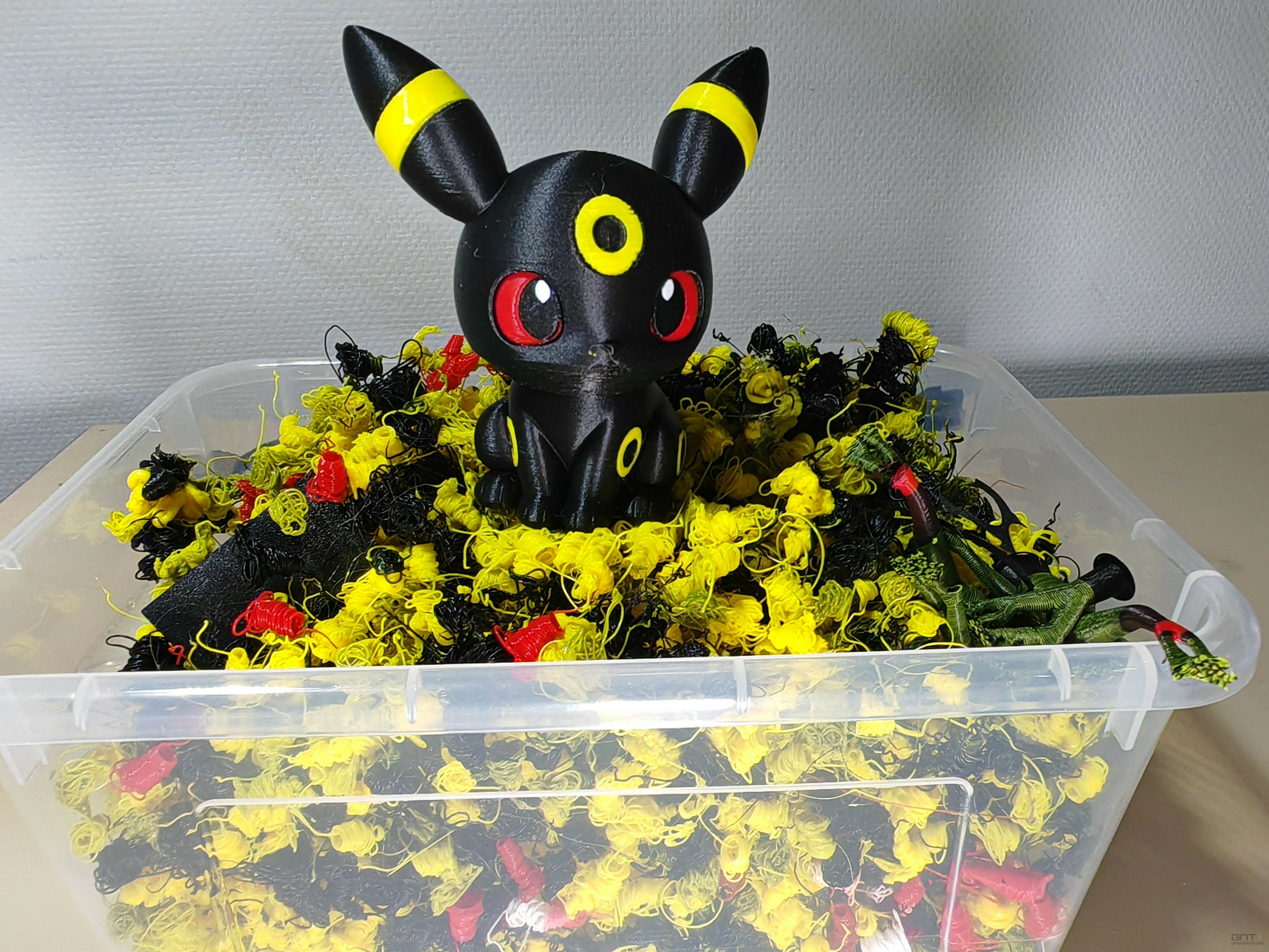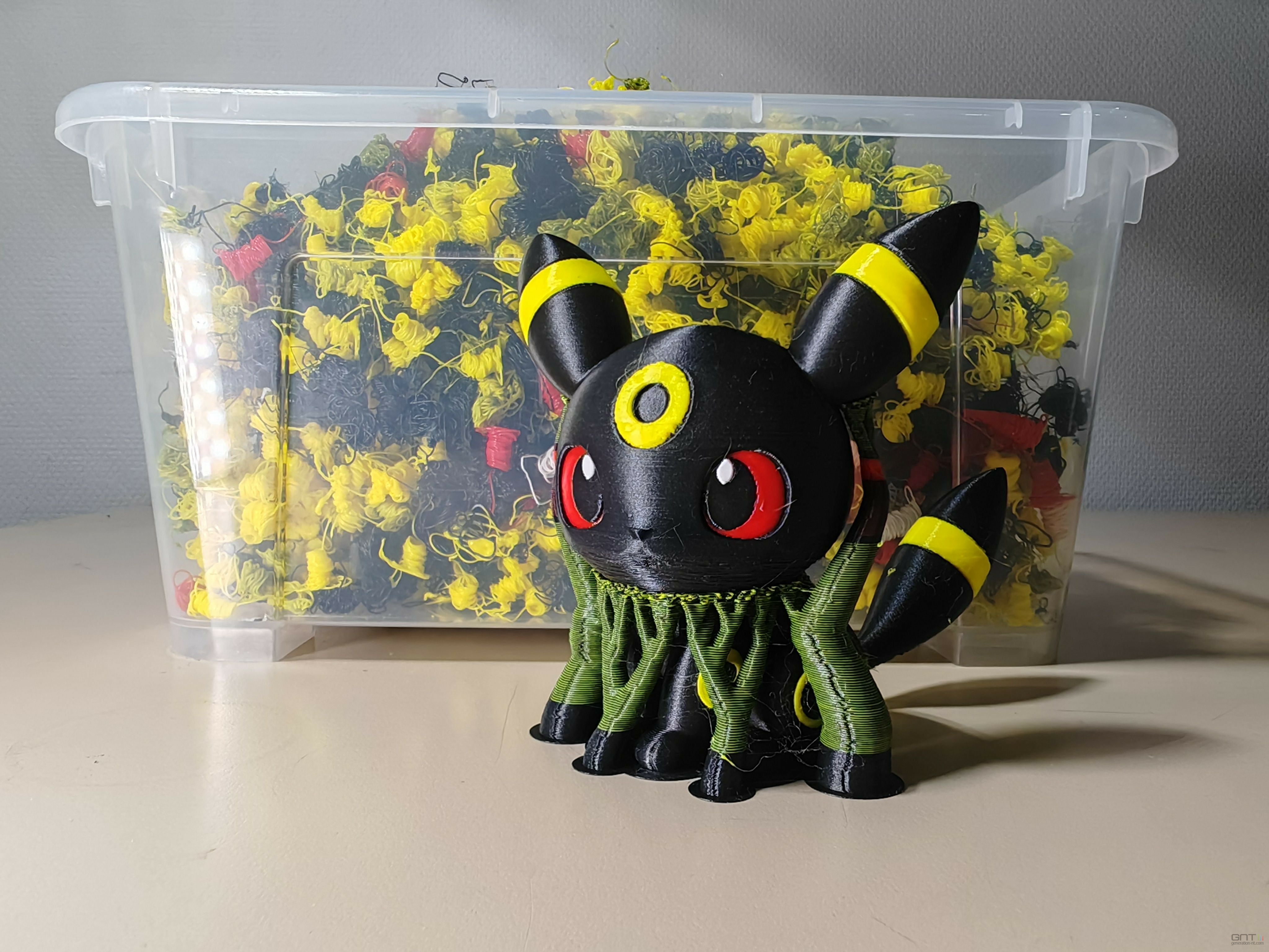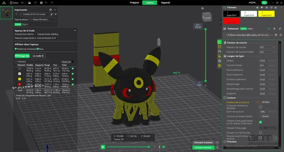 Dans notre test du Noctali de 10 cm de haut, la figurine à elle seule représente un poids de 67 grammes de filament auquel il faut ajouter 5,5 grammes de supports, une tour de purge de 35,6 grammes et malheureusement, 367 grammes de "poops"... Soit 67 grammes de pièce pour 408 grammes de perte... Cela reste encore trop important, mais les pertes liées à la tour et aux poops sont fixes, c'est-à-dire que, si l'on avait imprimé plusieurs de ces mêmes figurines, il n'y aurait pas eu de multiplication de ces facteurs de perte... Cela encourage à l'impression multiple, solution viable certes, mais qui entraine également d'autres déconvenues : si l'on avait imprimé cette pièce seule d'une seule couleur, elle aurait mis entre 1h et 1h 30... Ici, il nous aura fallu 15 heures d'impression, annoncées par le slicer... Temps qui a explosé en tenant compte des blocages de la bobine évoquée plus haut, ayant entrainé la perte de quasiment toute une nuit, machine en attente de solutionner le problème...
