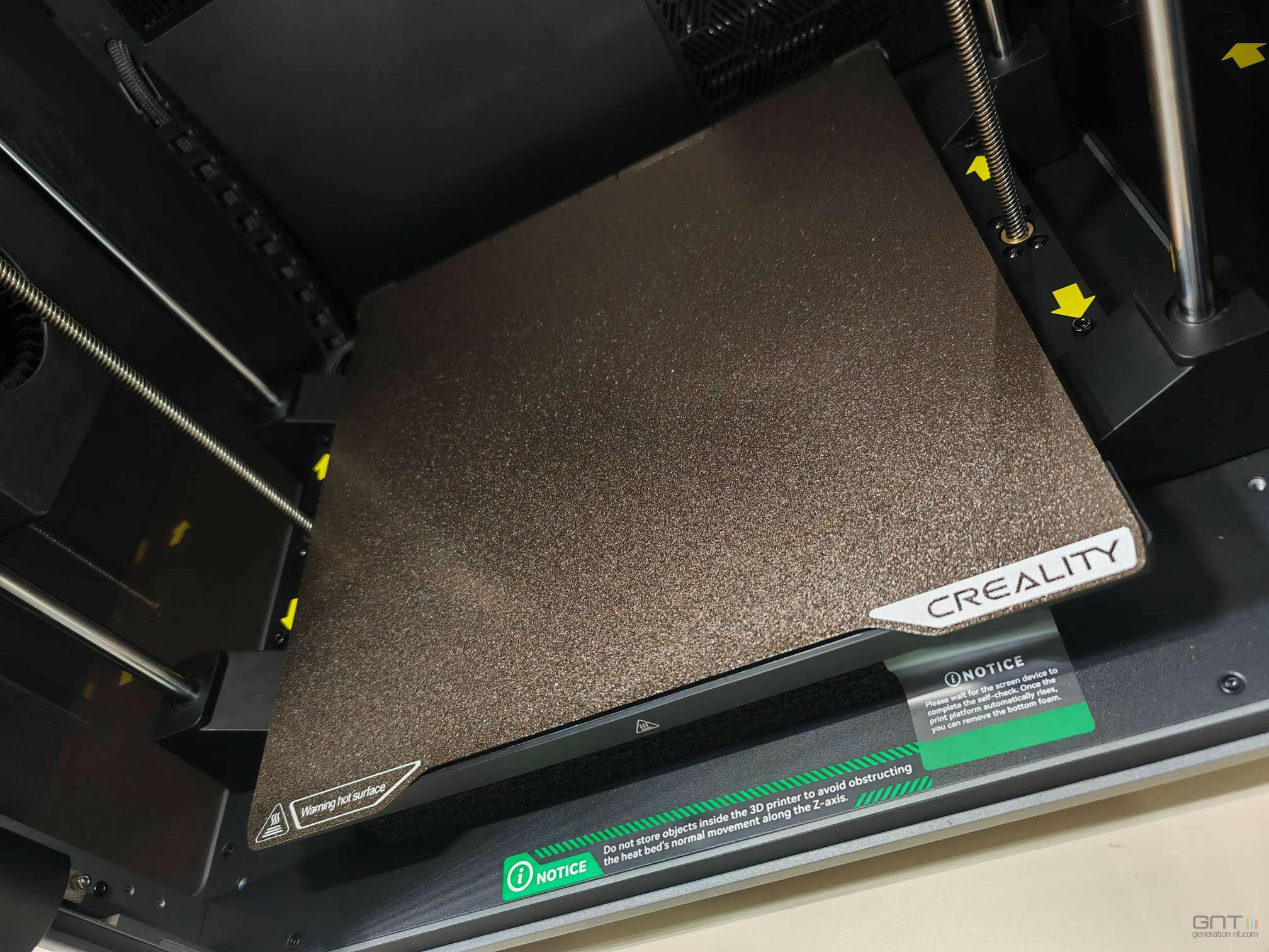 Le plateau, quant à lui, dispose de divers capteurs de pression pour offrir un leveling automatique des plus précis et sans aucune intervention humaine. Il est guidé par un seul moteur via deux tiges trapézoïdales et un jeu de courroies, et 4 guides. Il est, de base, positionné en mode haut pour l'impression et descend progressivement à mesure que la tête dépose les couches successives de filament. Le tapis proposé, flexible en PEI texturé, est excellent : il offre actuellement l'un des meilleurs compromis entre adhérence, polyvalence des matériaux et ergonomie pour l'utilisateur.