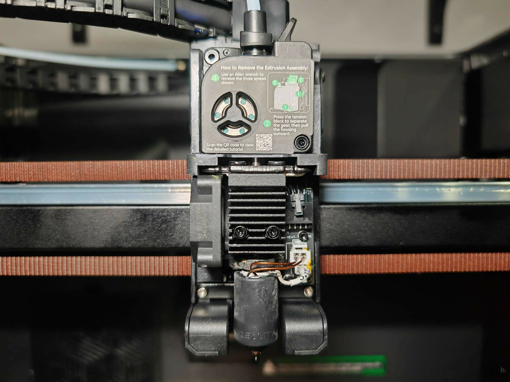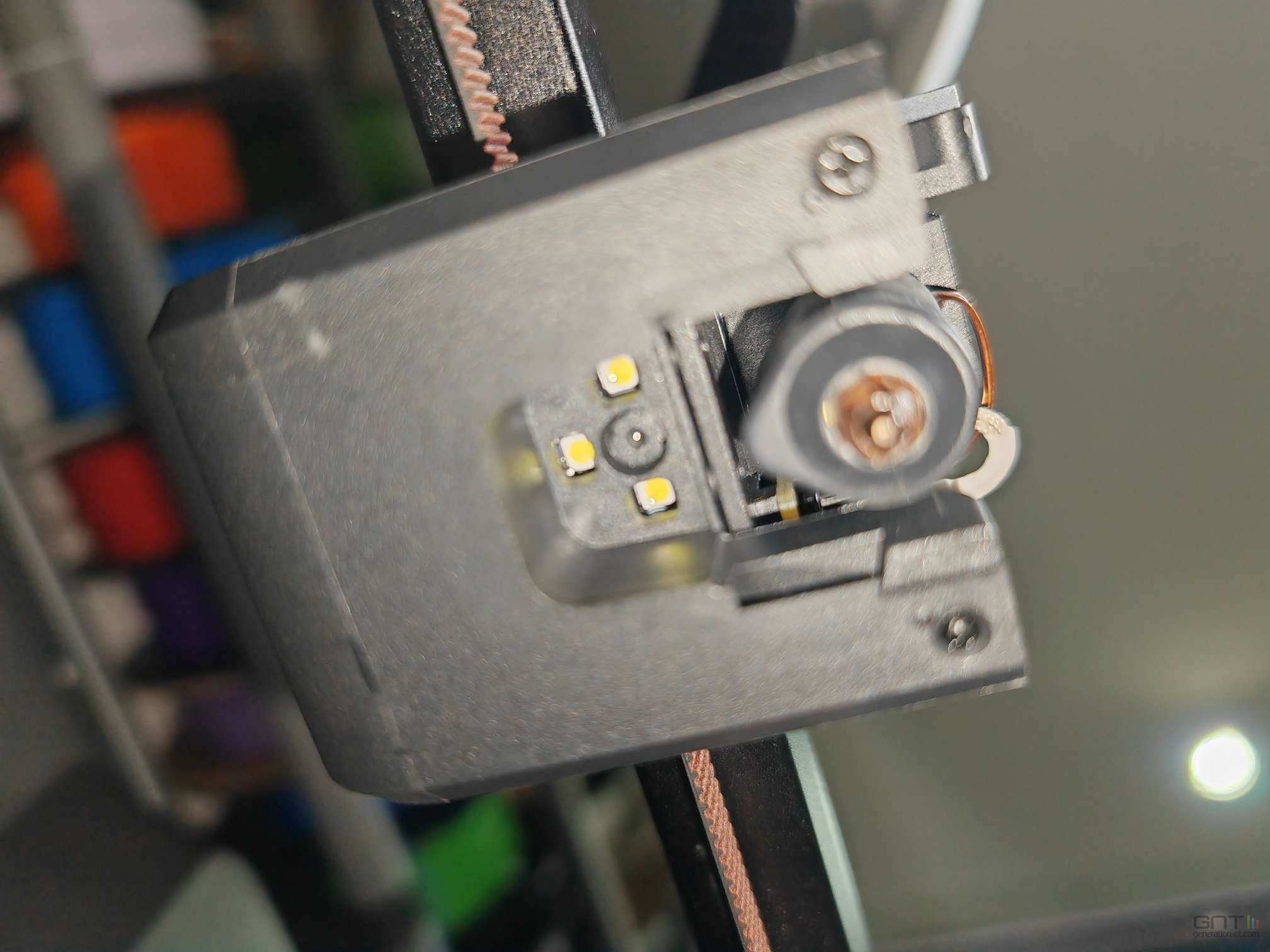 La tête est héritée de la K2 Plus sans grosse modification, si ce n'est un nouveau système d'insertion au niveau de l'extrudeur, plus ergonomique, ainsi qu'une caméra embarquée sous la tête qui n'est pas directement accessible (même si quelques repos Github proposent une solution tierce). Cette dernière n'a pas vocation à diffuser des images, mais plutôt à remplacer le module LIDAR de la K1 Max en permettant de photographier les tests de Pressure Advance pour automatiser les réglages de débit.