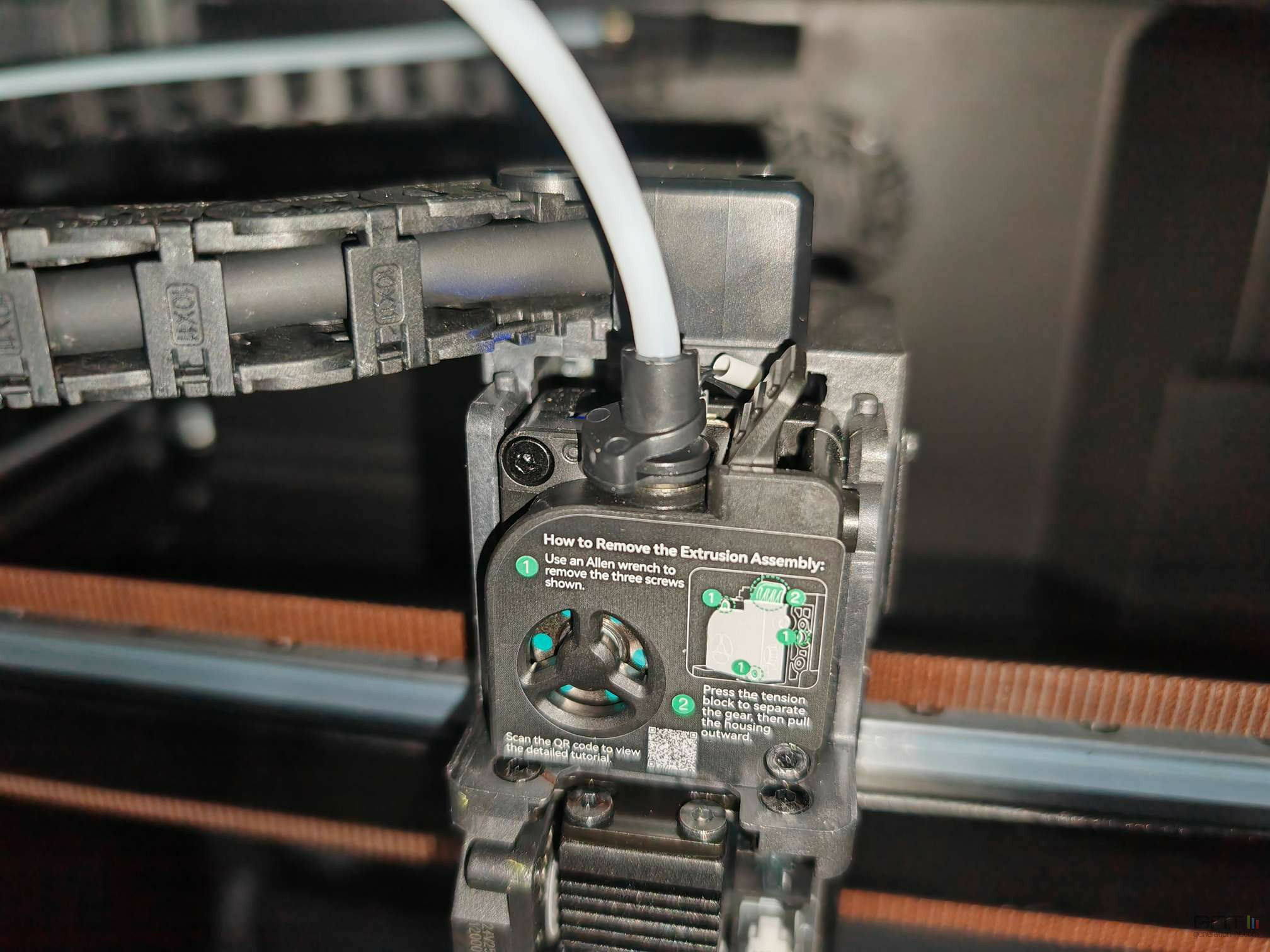 L'extrudeur nouvelle génération fait des merveilles : Creality a eu la bonne idée d'installer un capot aimanté sur sa tête, permettant d'accéder facilement à l'ensemble. Une fenêtre a été installée sur l'extrudeur ainsi que des repères visuels sur la roue principale d'entrainement, permettant de visualiser s'il tourne ou pas, et de repérer des sursauts caractéristiques d'un blocage.