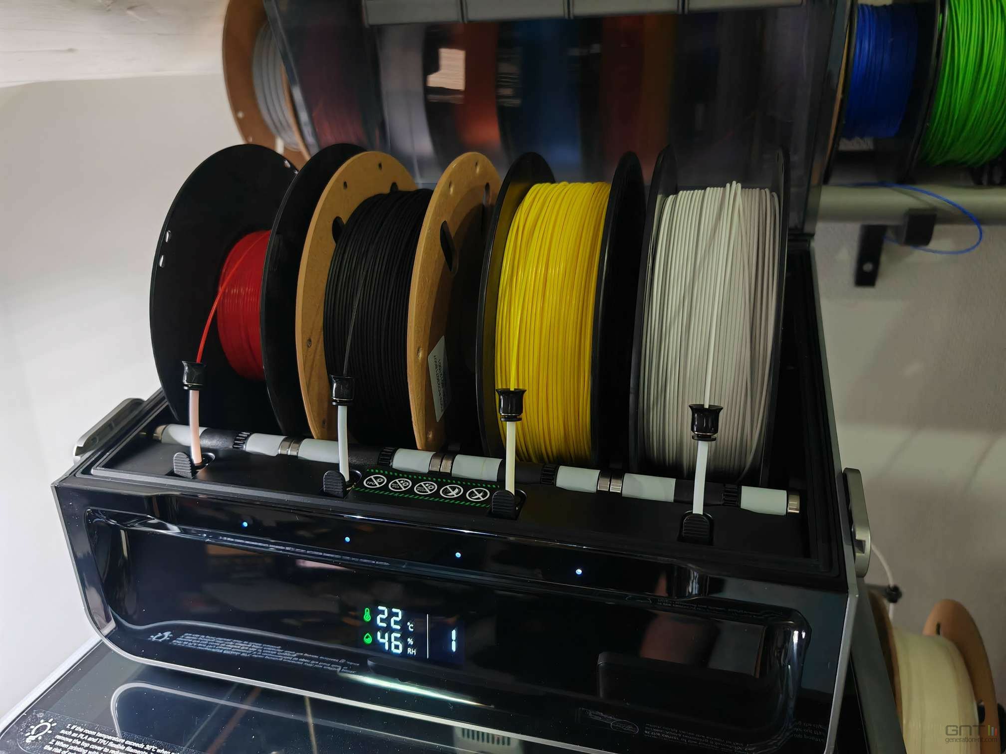 Au niveau de la tête d'impression, un cutter automatisé coupe le filament proprement avant chaque changement, garantissant une pointe nette pour le rechargement suivant. Certes, cela génère des déchets (les "poops" éjectés par une chute à l'arrière de la machine) (prévoyez un bac de récupération), mais c'est le prix de la fiabilité. Lors de nos tests, le système a géré des centaines de changements de couleur ("swaps") sans intervention humaine. C'est fluide, c'est propre, et c'est enfin au niveau des attentes. Seules quelques bobines peuvent poser problème : selon leur largeur, diamètre, ou même simplement le fait qu'elles soient en carton avec des bords non rigides : elles peuvent ainsi ne pas entrer dans leur emplacement, glisser ou simplement ne pas faire contact avec le système d'entrainement... Forcément, sans standardisation des bobines chez les fabricants, il ne peut y avoir de système parfait...