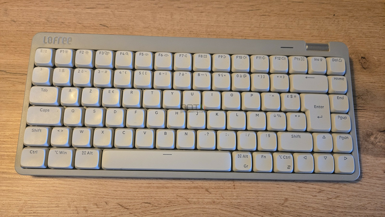 Ces teintes s'accorderont avec la majorité des intérieurs ou du fameux "espace 2 m2" auquel Lofree veut redonner un certain charme. La seule note excentrique vient de la molette du volume en métal en haut à droite du clavier. Celle-ci permet de monter ou baisser le volume par rotation ou de couper le son en appuyant dessus.