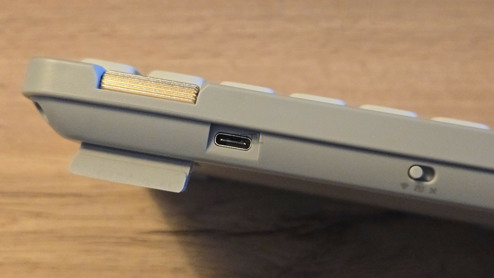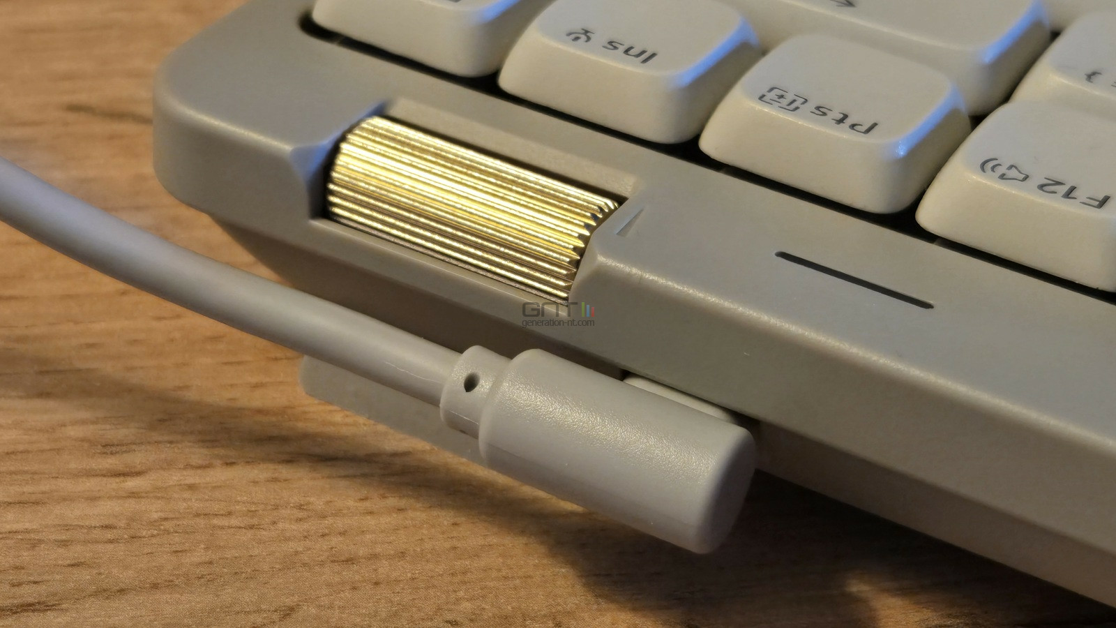 A côté, on trouvera une discrète zone lumineuse utilisée pour indiquer la charge de la batterie intégrée du clavier lorsqu'il fonctionne en mode sans fil. Le format du clavier est compact avec sa disposition resserrée tout en conservant des touches de bonne taille.