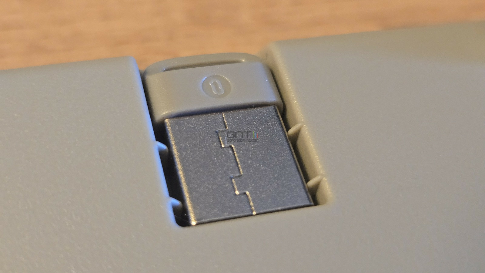 Le clavier peut être légèrement relevé par deux béquilles placées à l'arrière, offrant un léger confort supplémentaire par rapport à la disposition à plat (+3 ou +6 degrés). A l'arrière encore se dissimule une encoche dans laquelle vient se loger un dongle USB pour l'un des modes de liaison du clavier, qui en compte trois.