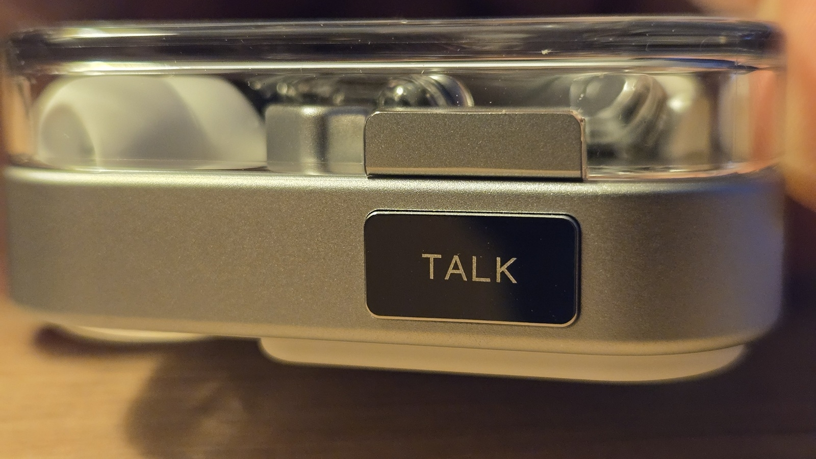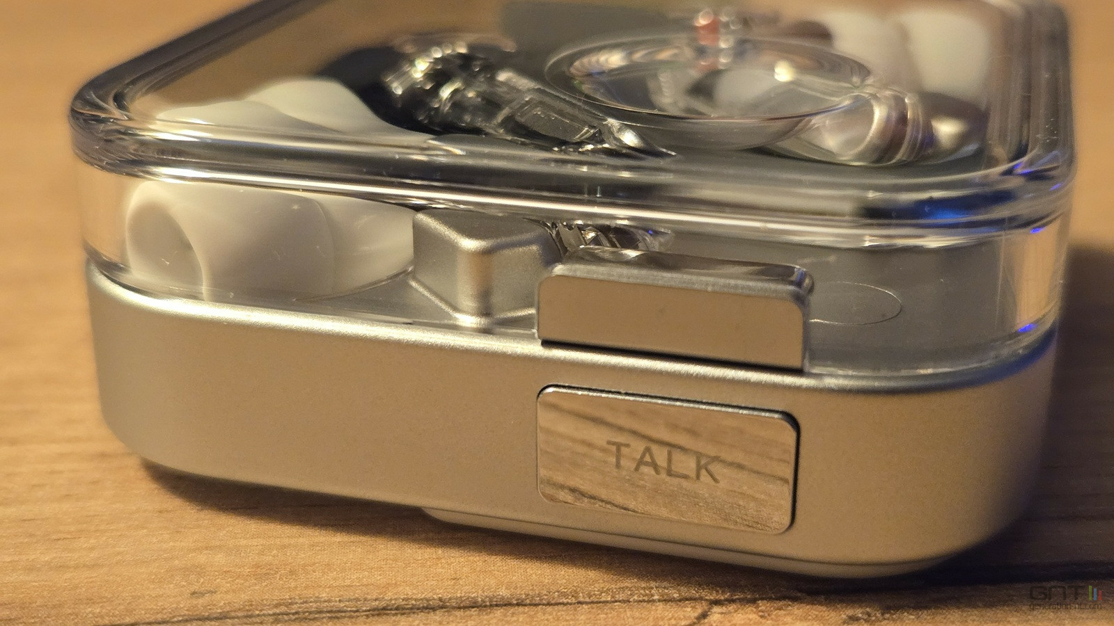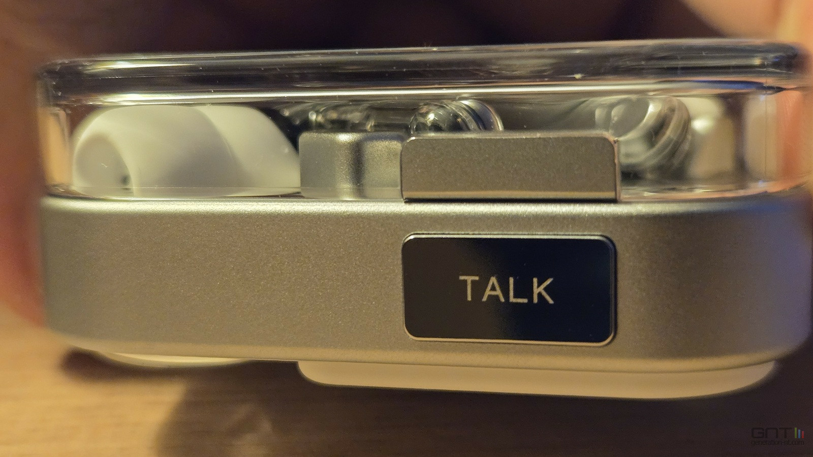 Le boîtier intègre un bouton Talk qui permet d'activer la fonctionnalité Super Mic. Cette dernière utilise deux micros MEMS pour prendre des notes vocales ou répondre à des appels, avec un focus sur les fréquences vocales pour éliminer tous les bruits environnants.