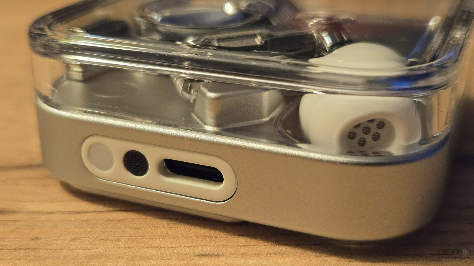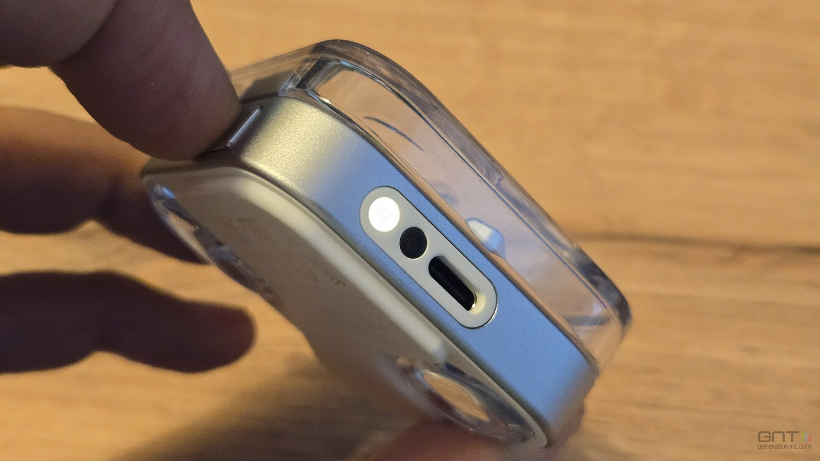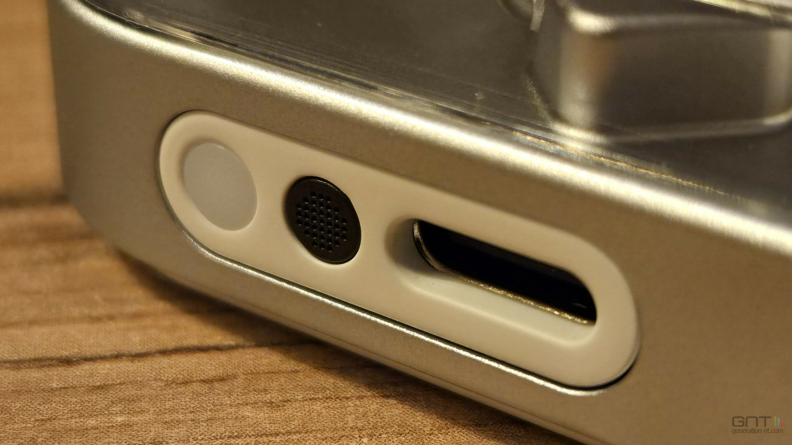 Le micro de la fonction Super Mic est visible à côté du port USB-C de l'étui de charge et il s'accompagne d'une LED indiquant si l'enregistrement est actif ou non.
