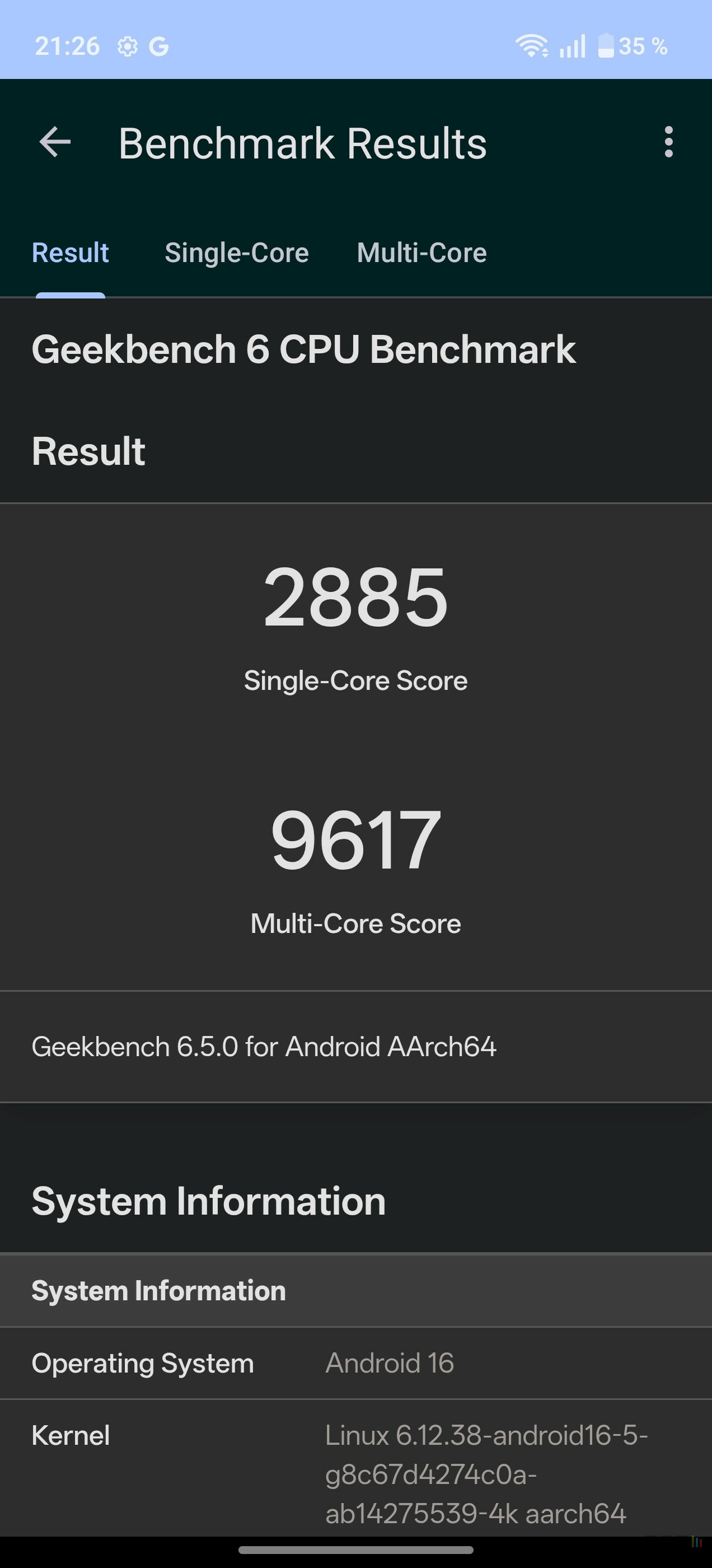 Du côté de Geekbench 6, le smartphone atteint des scores de 2885 points en test single core et 9607 points en test multiscore (vs 3680 / 10880 points pour le OnePlus 15), ce qui confirme un solide CPU.