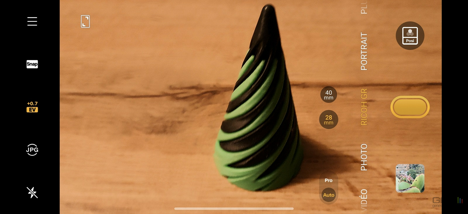 Le clou du spectacle vient du mode spécial Ricoh GR accessible depuis l'application photo et qui joue sur deux focales : 28 mm (équivalent 35 mm) et 40 mm (équivalent 50 mm).